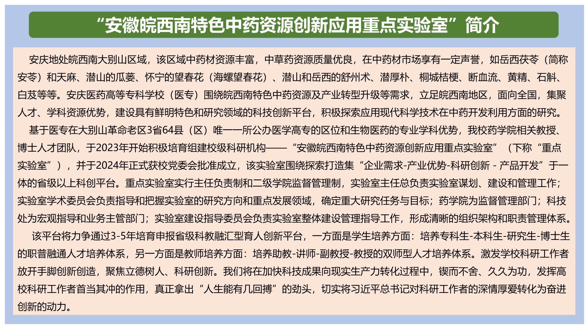 安徽皖西南特色中药资源创新应用重点实验室