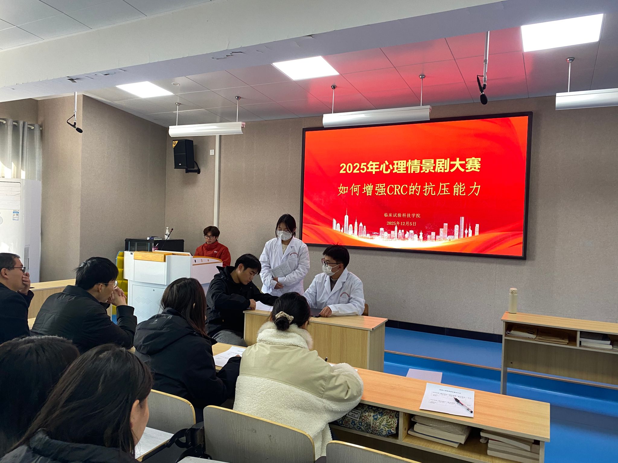 本次大赛紧扣临床试验专业特色,以“增强CRC抗压能力,赋能学生成长成才”为核心导向,鼓励学生立足专业学习与未来职业场景演绎心理困惑。比赛中,参赛队伍精神昂扬、配合默契,再现了CRC随访受试者时的沟通压力、数据整理中的焦虑等真实场景,通过细腻的人物心理刻画和直击人心的台词,引发在场师生强烈共鸣。