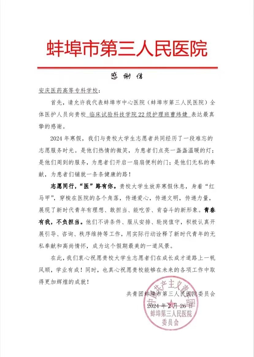 “大家要注意秩序,抽血的窗口在二楼,厕所在后门,儿童患者在隔壁大厅预约挂号……。”这就是我在2024年寒假的主要状态了,忙碌并充实着。大家好,我是来自22级临床试验护理班的曹炜婕。寒假期间,我参加了蚌埠市第三人民医院组织的大学生寒假志愿服务活动。活动期间,我立足岗位要求,服从院方安排,认真做好就诊咨询、门诊指引、秩序维护、自助机操作使用等工作,耐心地为患者提供自己力所能及的帮助,增强患者的就医满意度。