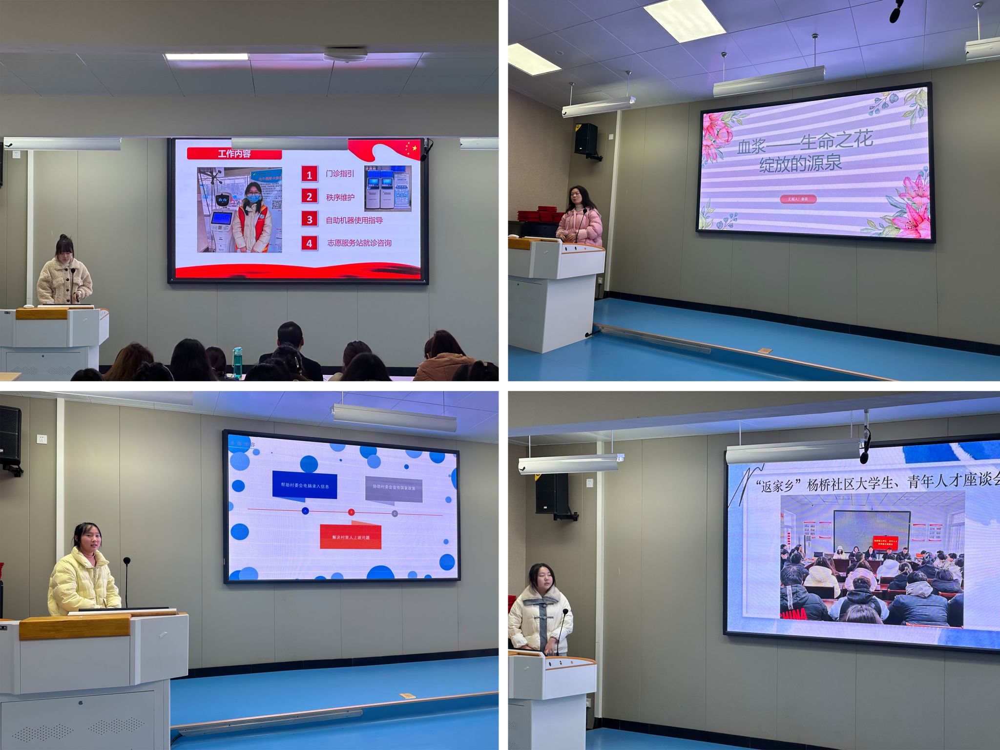 大会伊始,主持人介绍了会议的背景和基本流程。随后在主持人的宣布下,本次“返家乡”社会实践活动交流会暨表彰大会正式拉开帷幕。首先,由在“返家乡”社会实践活动中的表现优秀的先进个人代表依次分享寒假“返家乡”社会实践活动的具体经历和感受。所有上台分享的同学都做了精美的PPT,他们有的分享了假期志愿铲冰除雪、保证道路畅通的经历;有的报告了自己作为医院志愿者的事迹,帮助患者就医的心得体会;有的展示了自己参与基层政务工作的过程,表达了参与志愿服务的重要意义……优秀代表的先进事迹引人入胜,同学们都听得津津有味。分享结束,现场掌声雷鸣,这是同学们对先进个人的敬佩,也是对自己的鞭策和激励。