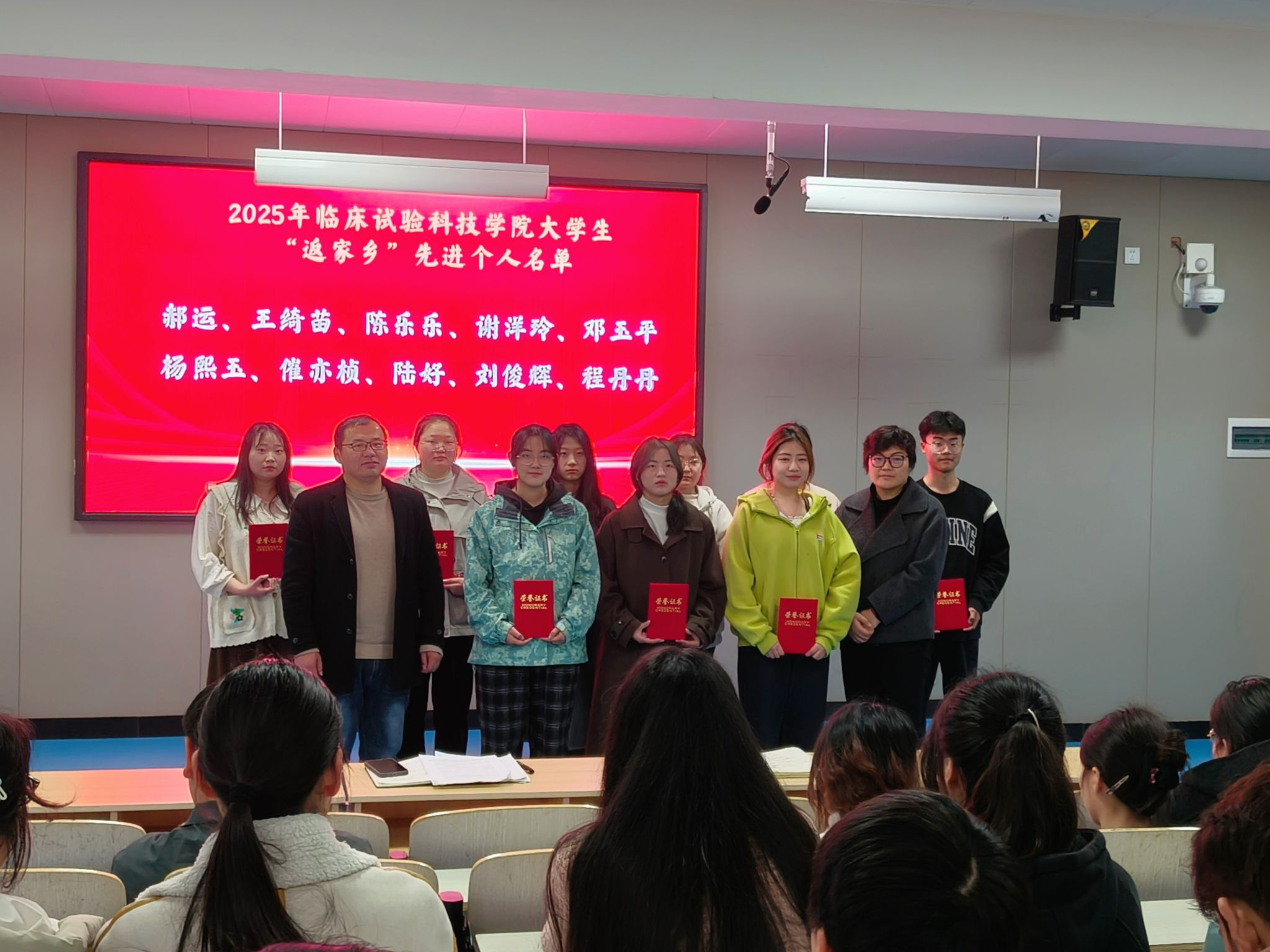 会上,学院“返家乡”工作负责人宣读了2025年寒假“返家乡”社会实践活动先进个人名单。学院党支部书记任丽英和团总支书记刘双虎为获奖同学进行颁奖并合影留念。