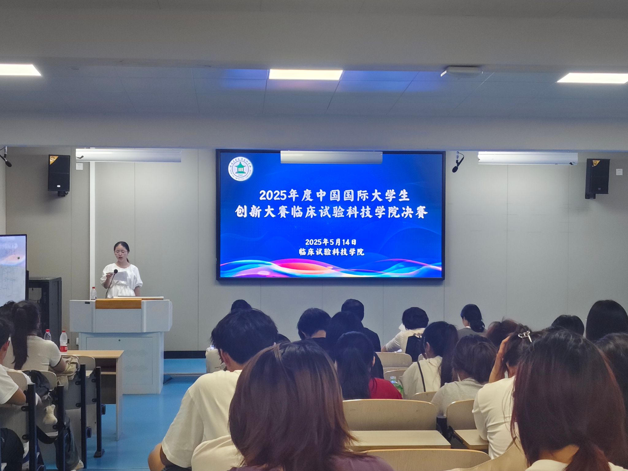 为激发学生创新潜能,搭建实践交流平台,2025年5月14日,临床试验科技学院在第八阶梯教室举办2025年度中国国际大学生创新大赛学院决赛。