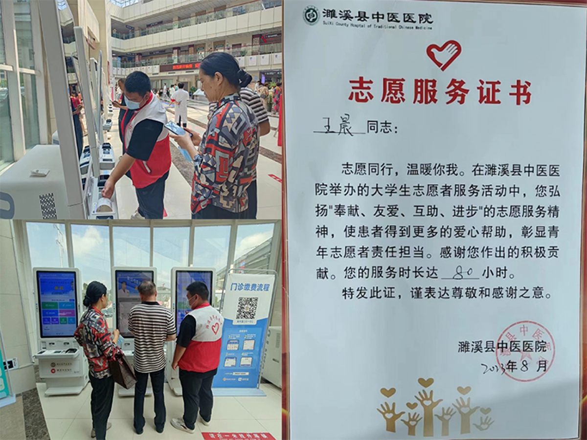 主要事迹:2023暑假期间,报名参加了由淮北市团委和濉溪县团委组织的“青鸿归乡”大学生暑期社会实践活动,根据濉溪县团委安排,王晨同学在濉溪县中医院进行志愿服务活动,主要在中医院不同的科室之间学习帮忙,帮助医院患者挂号、缴费等导医事项。目前,仅暑期志愿服务时长已达80小时。