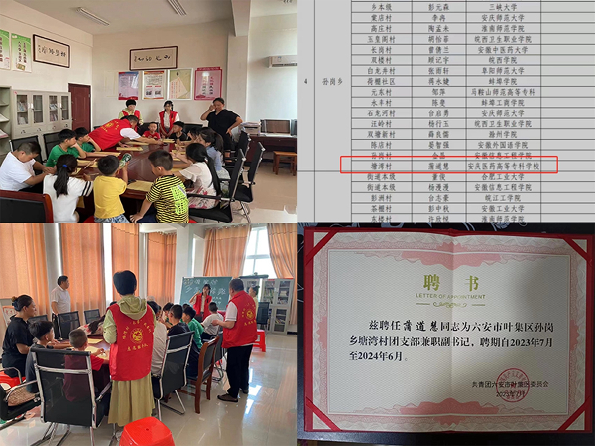 主要事迹:2023暑假期间,积极响应“返家乡”活动号召,报名了由六安市叶集区关于选拔叶集籍在校大学生兼任乡镇(街道)、村(社区)团组织副书记的活动,并成功选任为孙岗乡塘湾村团组织兼职副书记,任期一年。工作期间,蒲道慧主要负责打印文件、整理档案、录入档案信息、活动拍摄等工作,并且负责带领党员村民学习《习近平关于社会主义精神文明建设论述摘编》《中华人民共和国简史》等书籍,组织广场舞比赛,篮球比赛,青少年书法培训等活动,相关事迹在叶集共青团微信平台报道。