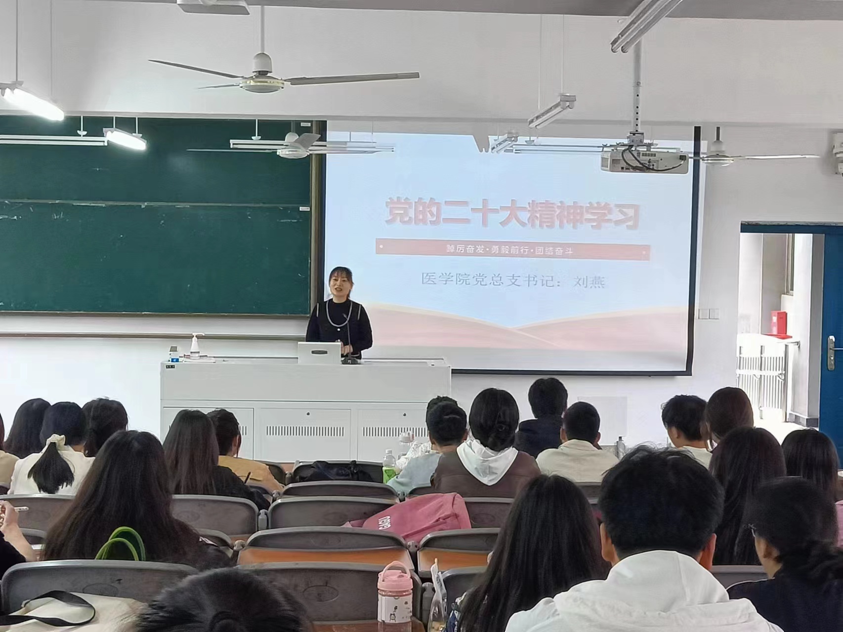 刘燕对本期培训班顺利开班表示祝贺,作为学校学习贯彻党的二十大精神宣讲团成员,为全体学员讲开班第一节党课。刘燕指出,党的二十大报告阐明了“两个确立”、“四个意识”、“四个自信” 和十三个方面成就等重要内容。希望青年学生们全面理解把握党的二十大报告阐明的新时代重大理论和实践问题,在党的二十大精神的指引下,提高政治站位,充分认识到办好本次培训班的重要意义,结合自身的医学专业实际,以青春之名,担时代之责,做理想远大、信念坚定的好青年!