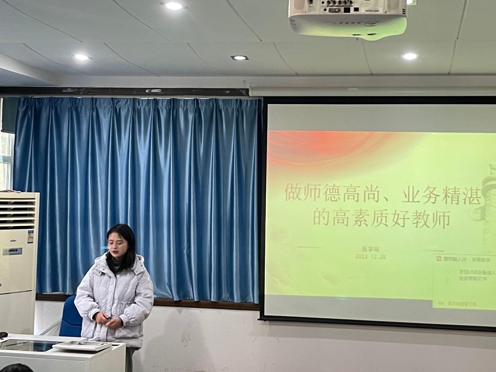 党员教师丁雪纯以“做师德高尚,业务精湛的高素质好教师”为题,围绕师德师风,从“为什么要开展师德师风建设”“当前我院师德师风上存在的一些问题”“对我院加强师德师风建设的一些建议”三个方面展开讲授,强调师德师风的重要性,并且深刻剖析了目前存在的问题,并建议要齐抓共管,实现师德师风建设全覆盖;扎实开展,推动师德师风建设全面落实;强化机制,实现师德师风建设常态化。