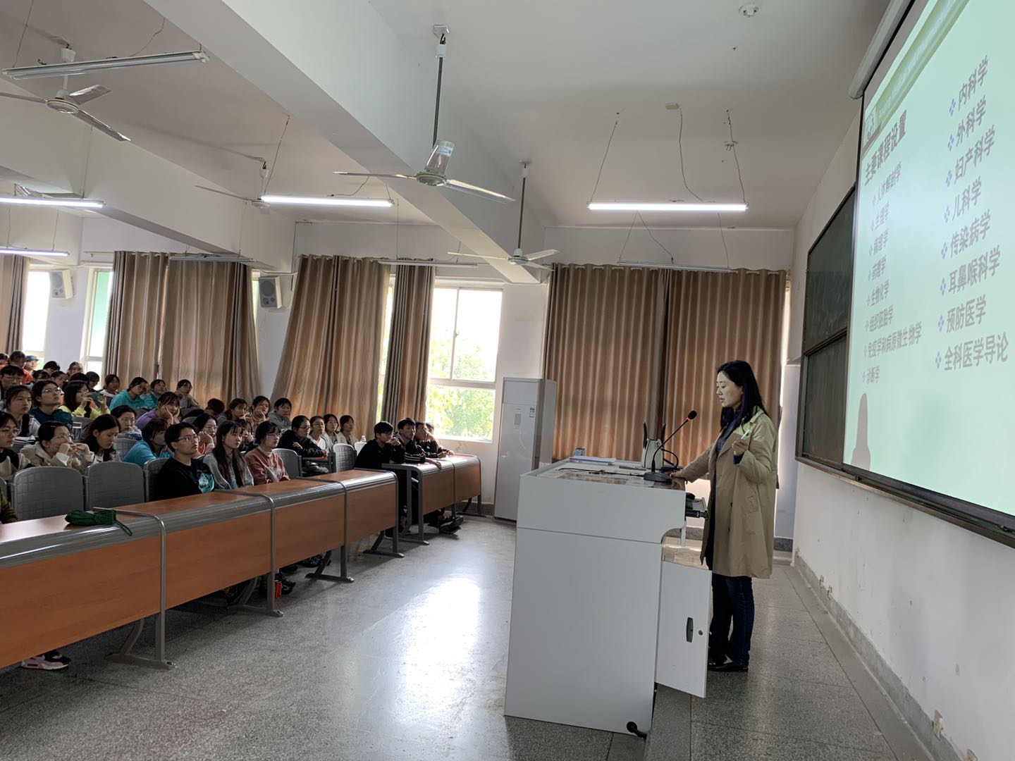 张老师先简要介绍了学校的发展历程和所开设的专业情况、临床医学系师资力量和实验实训中心的设施;接下来简要介绍了在校理论课程设置情况及三年级的实践实习地点。同学们逐渐对临床医学有了一定的认知,也了解了将要学习的科目和未来的实习安排。