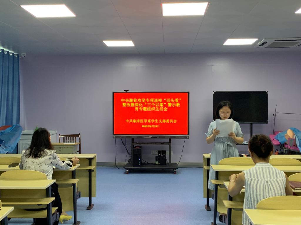6月29日,临床医学系学生党支部在妇产科示教室召开中央脱贫攻坚专项巡视“回头看”整改暨深化“三个以案”警示教育专题组织生活会,会议由支部书记邓艳主持。