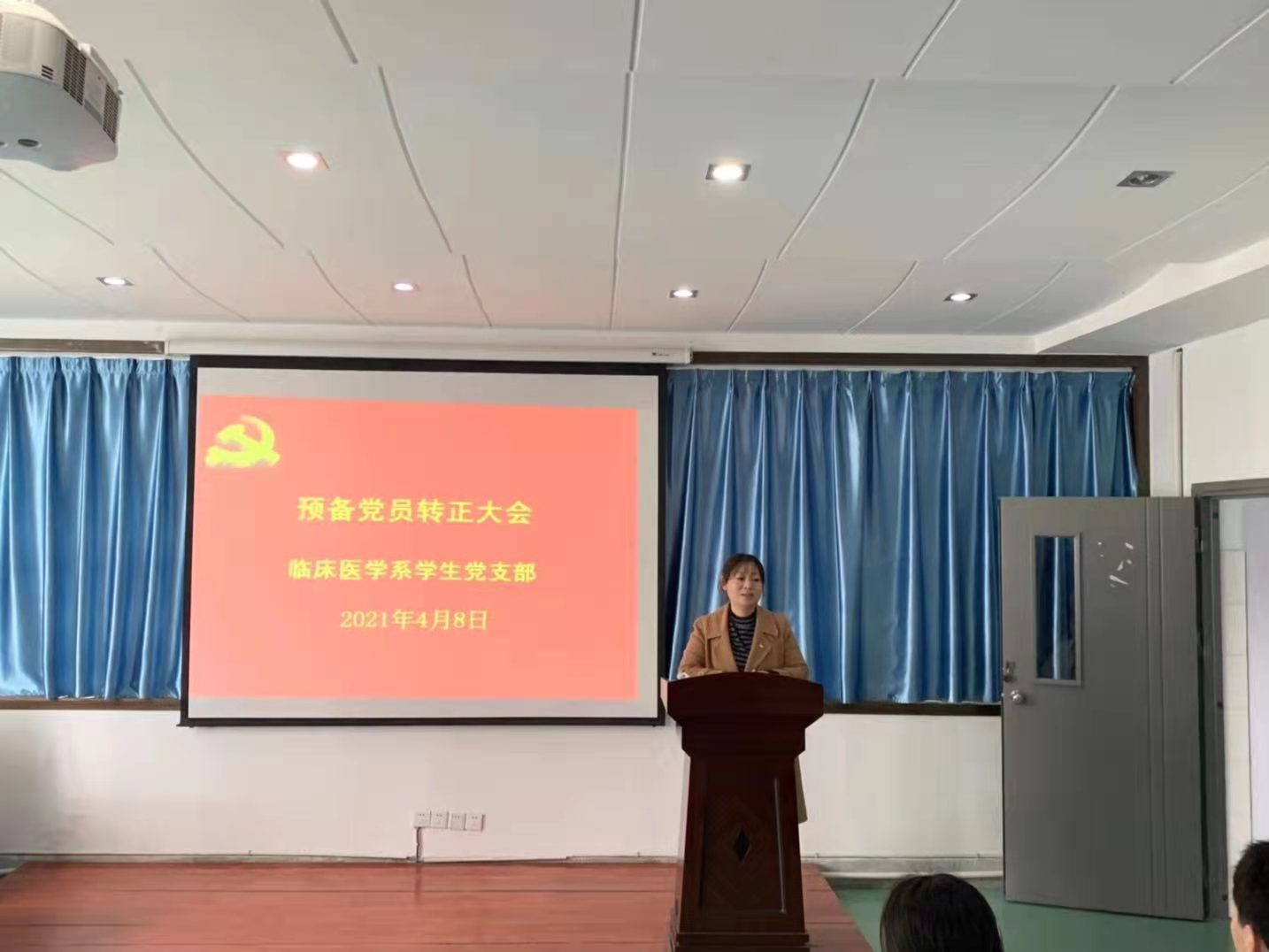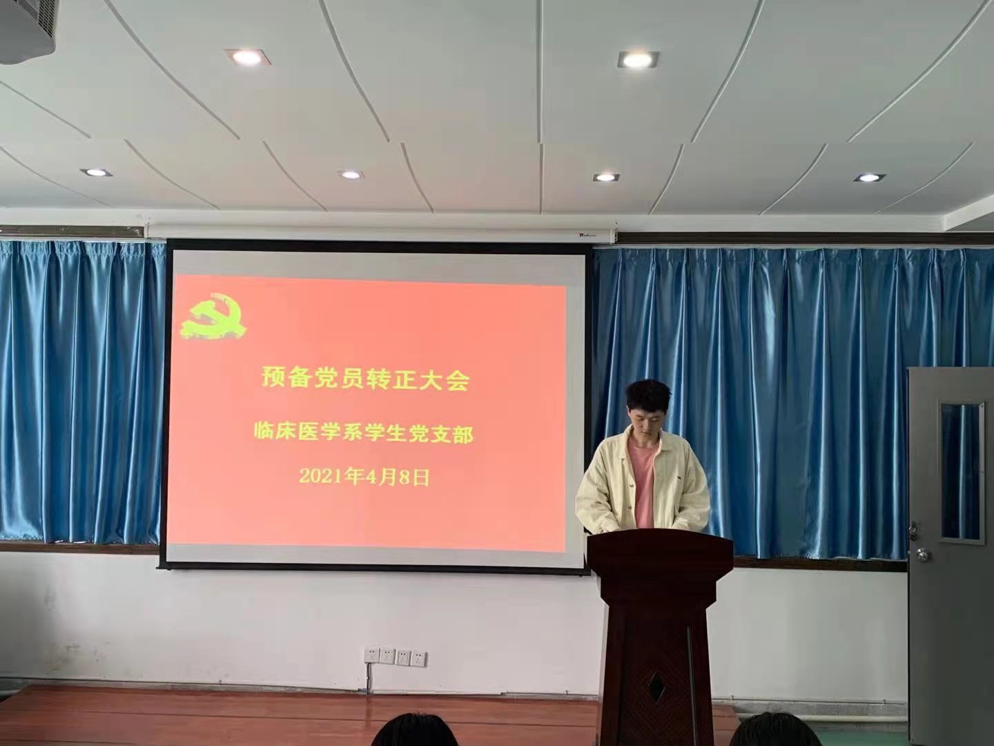 4月8日,临床医学系学生党支部在外科手术观摩室召开预备党员转正大会。临床医学系党总支书记刘燕、副书记吴鸿玲、学生支部党员及预备党员参加会议,会议由学生支部组织委员陈梦主持。