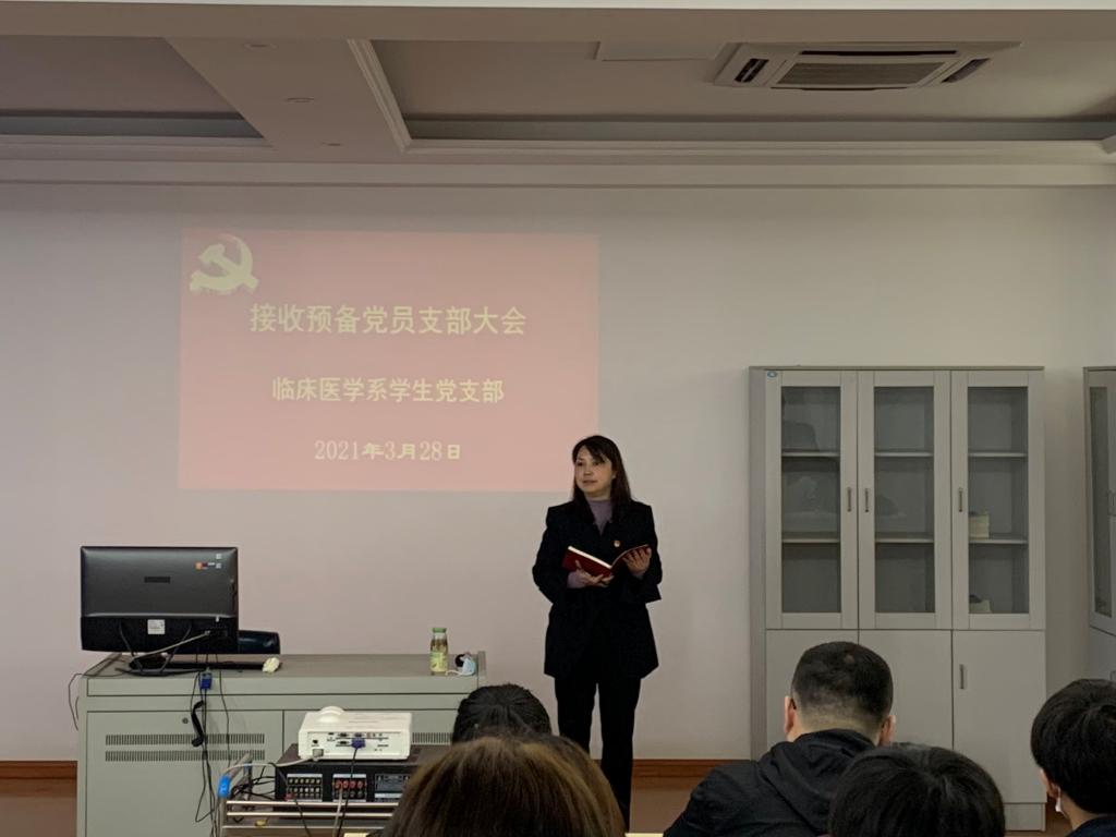 3月28日上午,临床医学系学生党支部在临床内科示教室召开接收预备党员大会,系党总支书记陈琪、系党总支副书记吴鸿玲、学生支部全体党员、学生入党介绍人以及学生发展对象出席本次会议,会议由学生党支部书记邓艳主持。