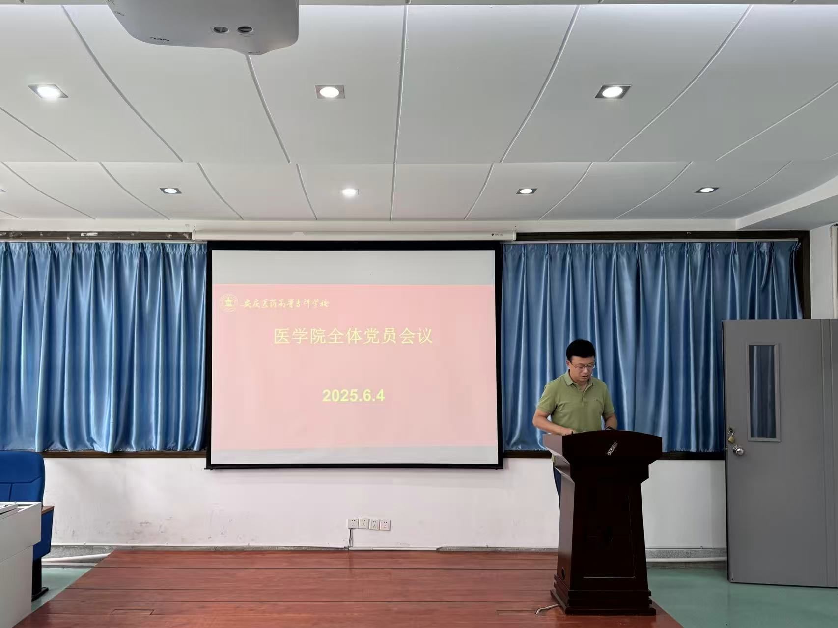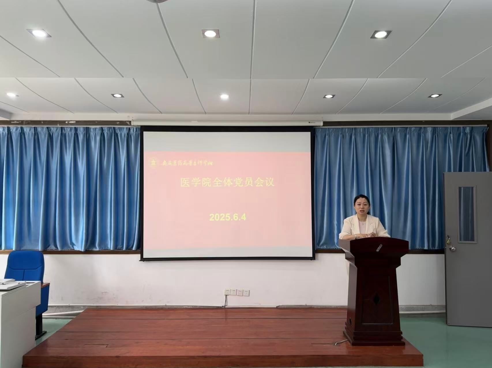 2025年6月4日,医学院党总支在外科手术观摩室召开全体党员会议,会议由医学院党总支书记、院长刘燕主持,医学院全体党员参加,副校长毛以成参加学习。