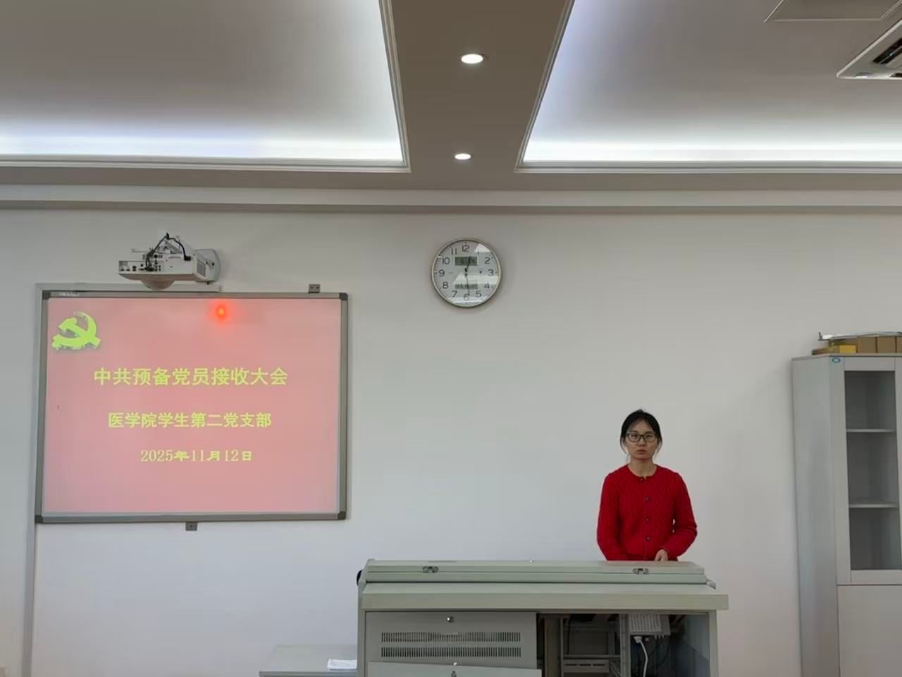 2025年11月12日,医学院党总支学生第二党支部在医学院实训楼四楼示教室召开接收预备党员大会。大会主要讨论并决议是否接收张杰等16名同志为中共预备党员。会议由支部书记陈梦主持,医学院党总支、学生第二党支部全体党员,发展对象培养老师及发展对象参会。