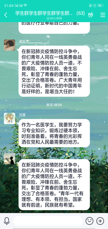 本次活动以各班级团支部为单位,通过线上研讨与线下自学相结合的方式进行开展。活动过程中,各班级团支书积极召开线上团支部会议及讨论,组织班级青年团员阅读习近平总书记回信,进行集中学习和总结研讨。观看完习近平总书记的回信,每位同学都有很深刻的感受,积极的参与讨论,进行集中学习和总结研讨,说出了对于习近平总书记信中话语的理解,同时每位同学也在此次讨论和学习的过程中收到了很大的鼓舞和启发。