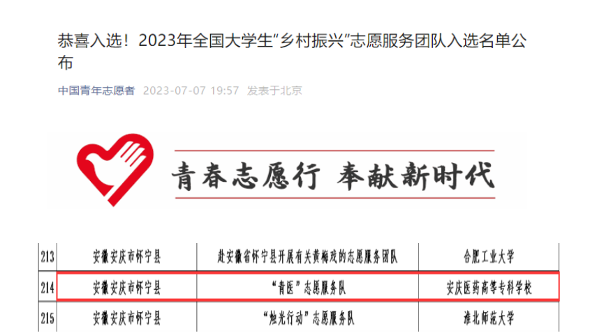 为深入学习宣传贯彻习近平新时代中国特色社会主义思想和党的二十大精神,全力服务乡村振兴战略,动员引导青年学生投身乡村振兴一线,团中央青年志愿者行动指导中心联合100个县开展2023年全国大学生“乡村振兴”志愿服务项目。医学院“青医”服务队成功入选全国大学生“乡村振兴”志愿服务队。