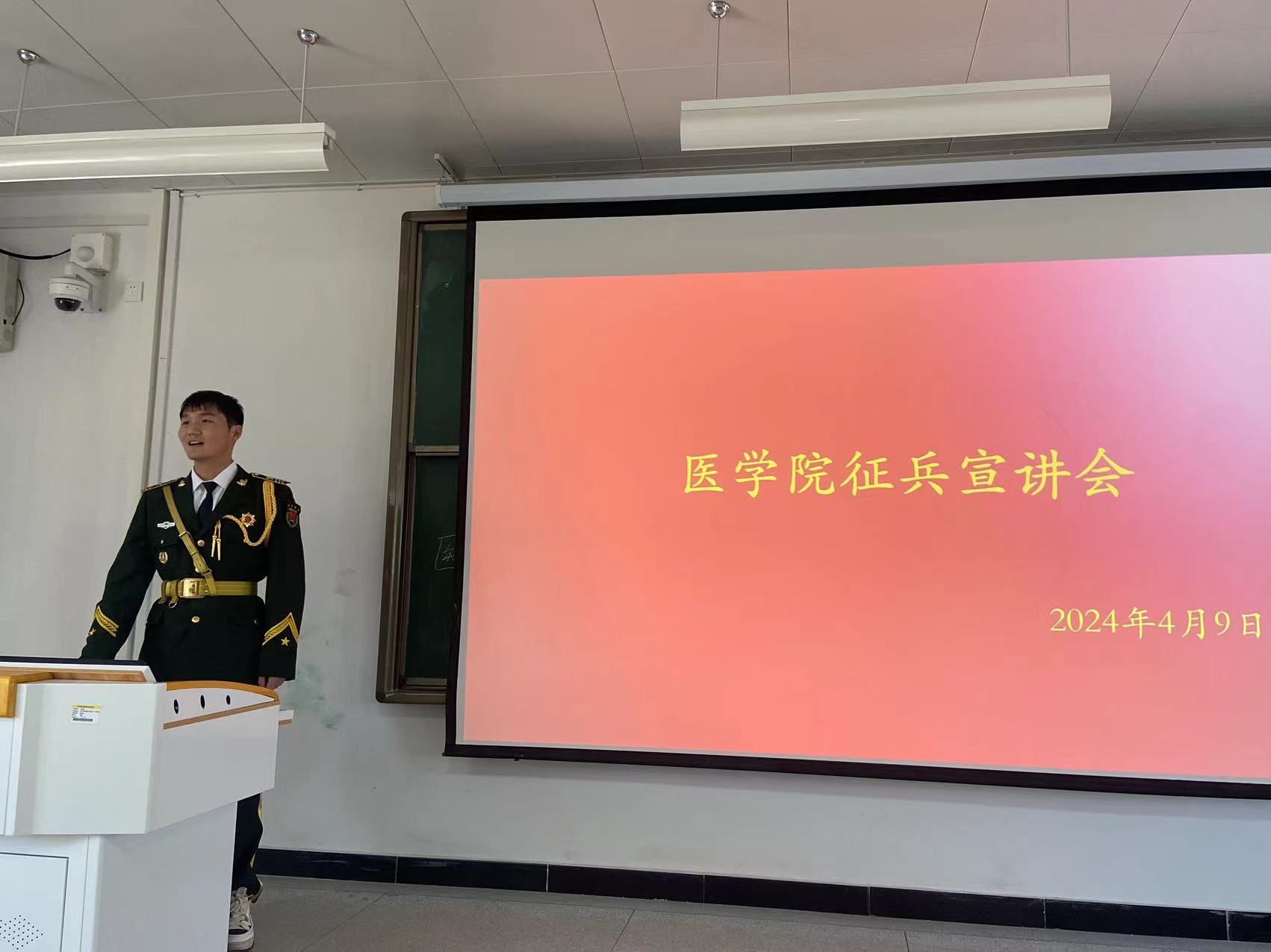 2024年4月9日中午,医学院2024年征兵宣讲会在教学楼第十一阶梯教室召开,宣讲会由医学院征兵专员王耀吟主持,医学院党总支书记、院长刘燕、副书记王华庆、医学院22、23级各班级男生代表参会。