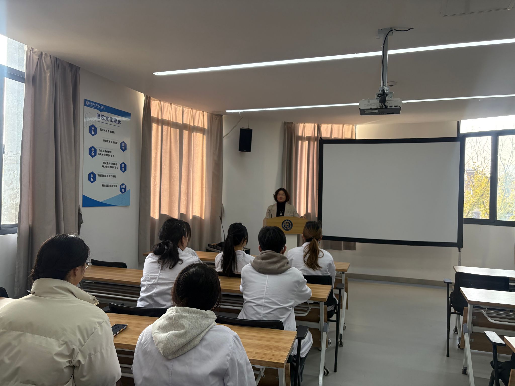 通过听取汇报、查阅资料、与学生座谈等形式,全面了解实习生的理论掌握、技能操作及职业素养表现。张爱荣对医院的教学管理规范性和学生培养成效给予肯定,并强调实习是医学教育的关键环节,需持续优化“理论-实践”衔接机制,确保学生学以致用。收集反馈意见,为后续教学计划调整提供依据。院方表示将进一步完善带教体系,强化临床思维训练。