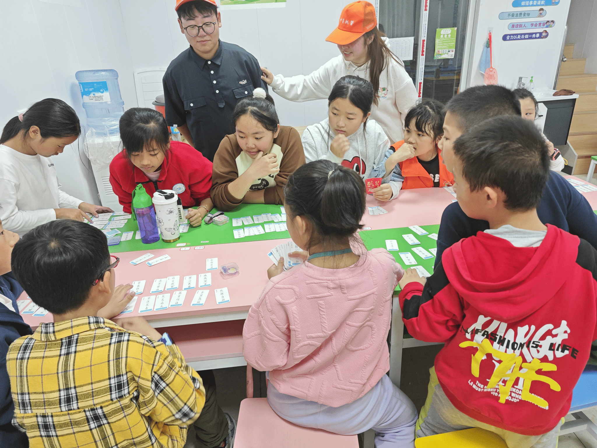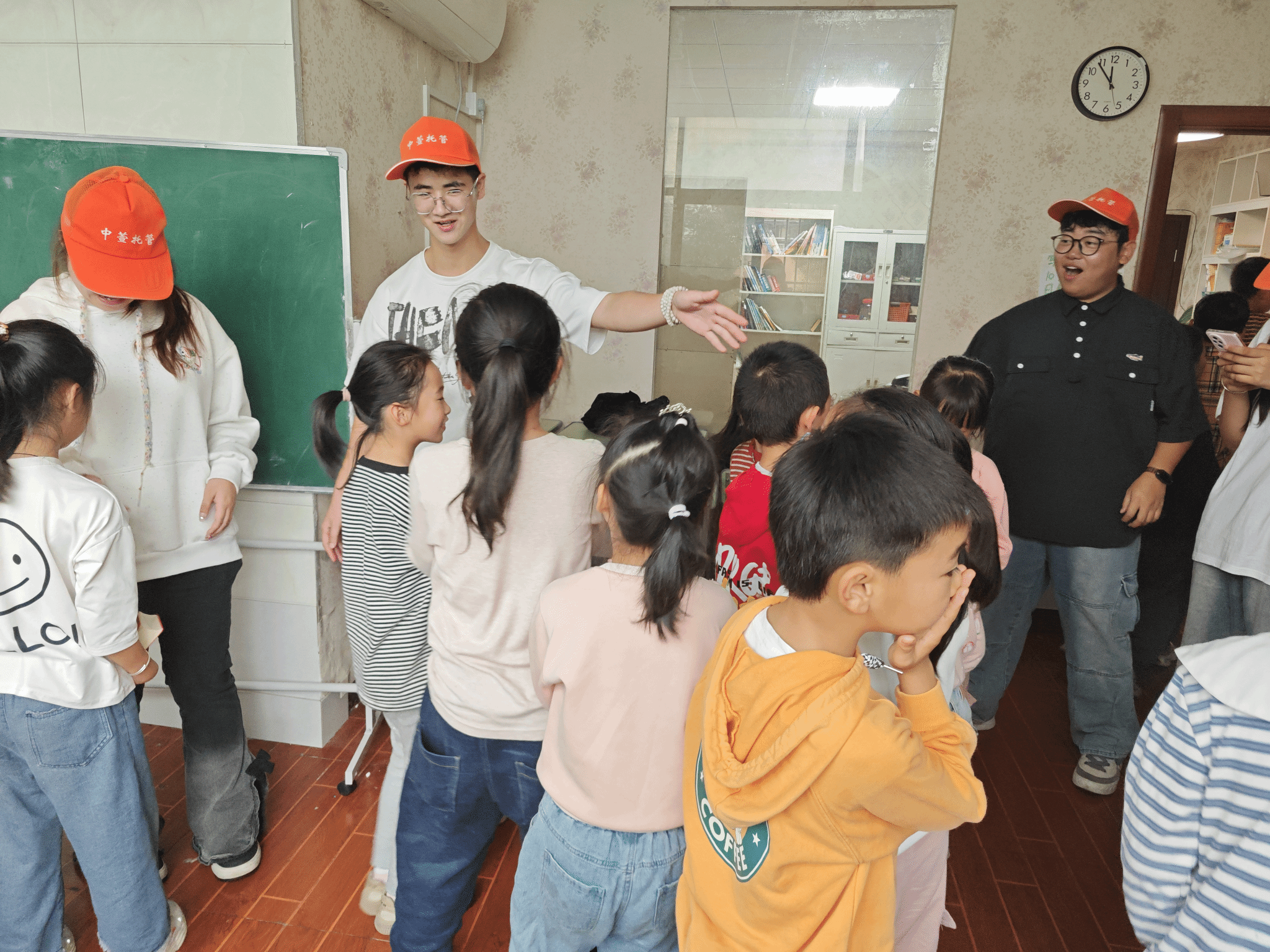 随后,志愿者们进行点名并跟随中心工作人员一起为小朋友发餐食。饭后指导小朋友们完成作业、陪同他们做游戏,如萝卜蹲、围圈圈、成语接龙等益智小游戏,现场的气氛非常活跃,小朋友们积极参与,勇于表现,和志愿者们打成一片,欢声笑语回荡在托管所里。