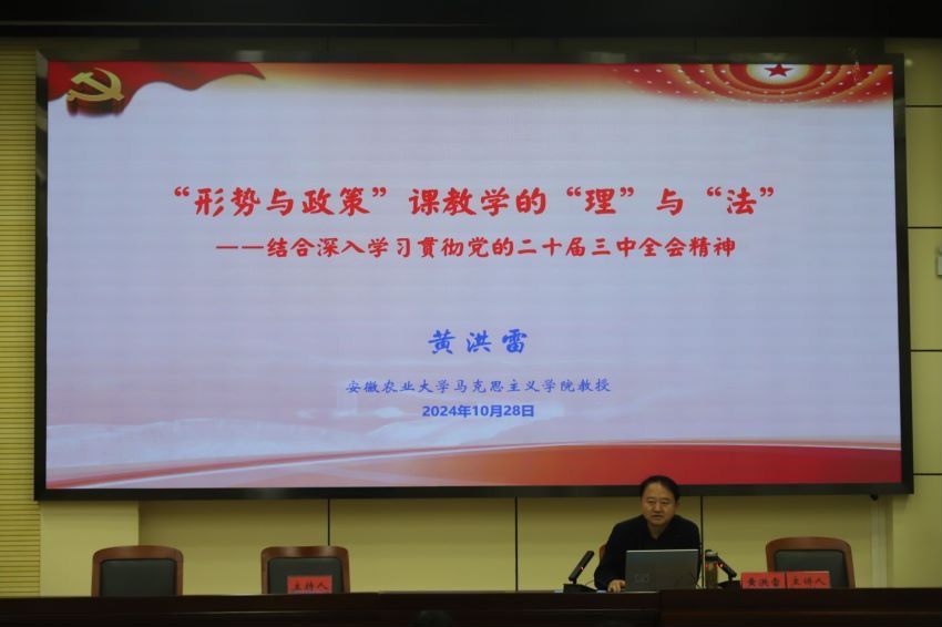 10月28日,在全校上下掀起学习习近平总书记在安徽考察时的重要讲话精神的热潮之际,安徽农业大学党委委员、马克思主义学院教授黄洪雷应邀来到今年会,以“形势与政策”课教学的“理”与“法”——结合深入学习贯彻党的二十届三中全会精神为题,为全校师生作专题报告。校党委副书记张仕庆,校党委委员、药学院党总支书记、院长刘毅出席,部分党务干部、专职思政课教师、学生思政委员、青马班学员近200人聆听报告。专题报告会由校党委委员、宣传部部长朱雯主持。