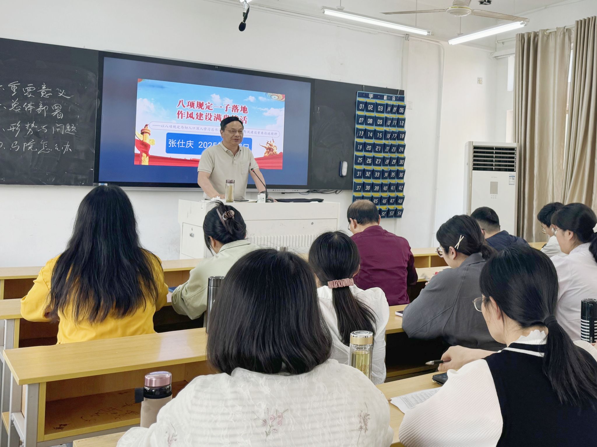 张仕庆以“八项规定一子落地 作风建设满盘皆活”为主题,系统梳理了中央八项规定精神的历史沿革、理论逻辑、精神实质与现实成就,围绕习近平总书记关于深入贯彻中央八项规定精神学习教育的重要讲话和重要指示精神,结合学校工作实际,从学习教育重要意义、总体部署、形势与问题和马院高质量发展四个方面做了系统深刻的阐释,为全体党员教师上了一堂思想深刻、内涵丰富的专题党课,着力增强了全体党员教师强化作风建设的思想自觉与行动自觉。