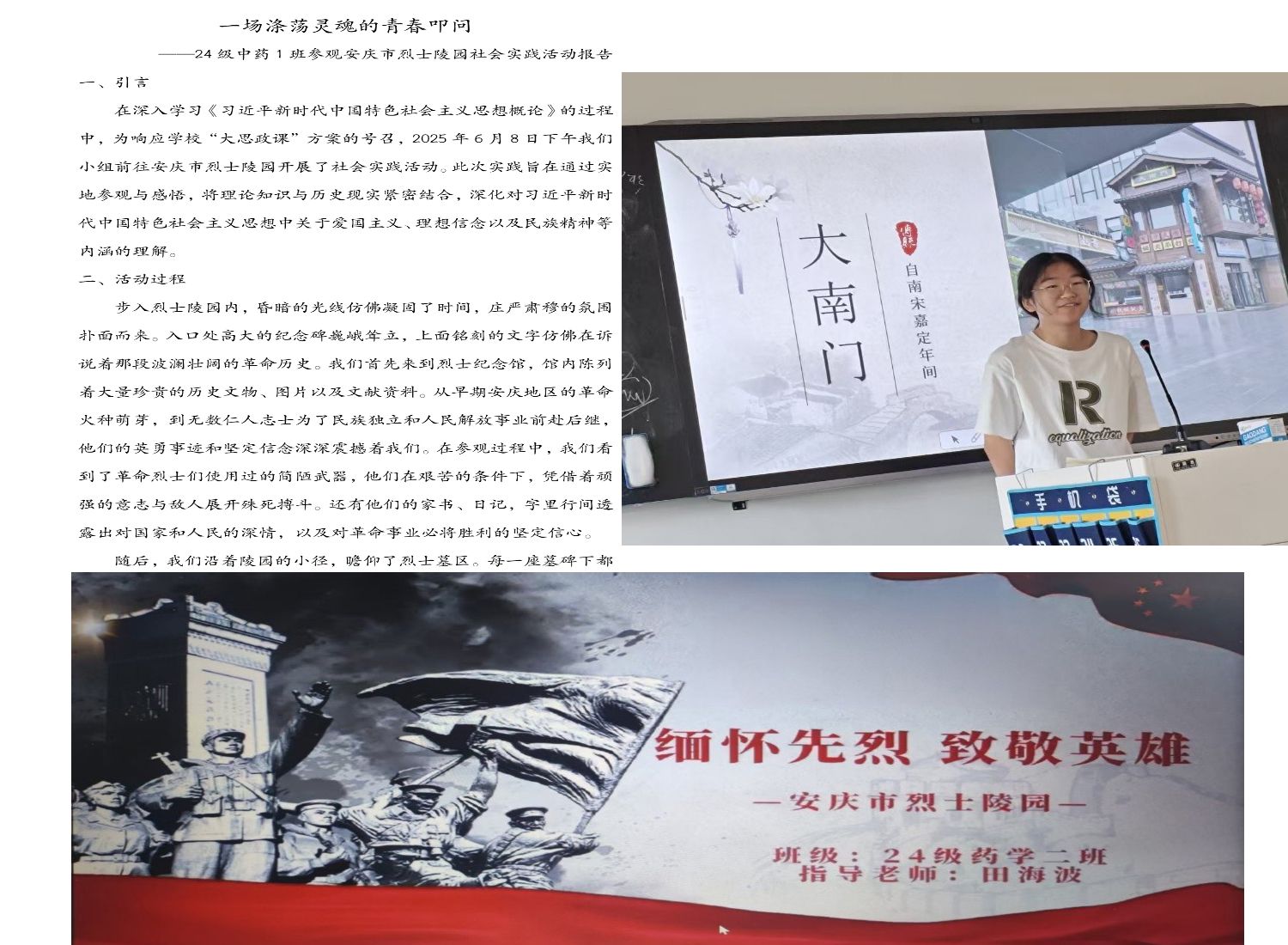在安庆烈士陵园,同学们通过珍贵的历史文物和影像资料,沉浸式地感受了波澜壮阔的革命历程,深刻理解了中国共产党为什么“能”、马克思主义为什么“行”、中国特色社会主义为什么“好”,在追寻红色记忆中筑牢了理想信念之基。