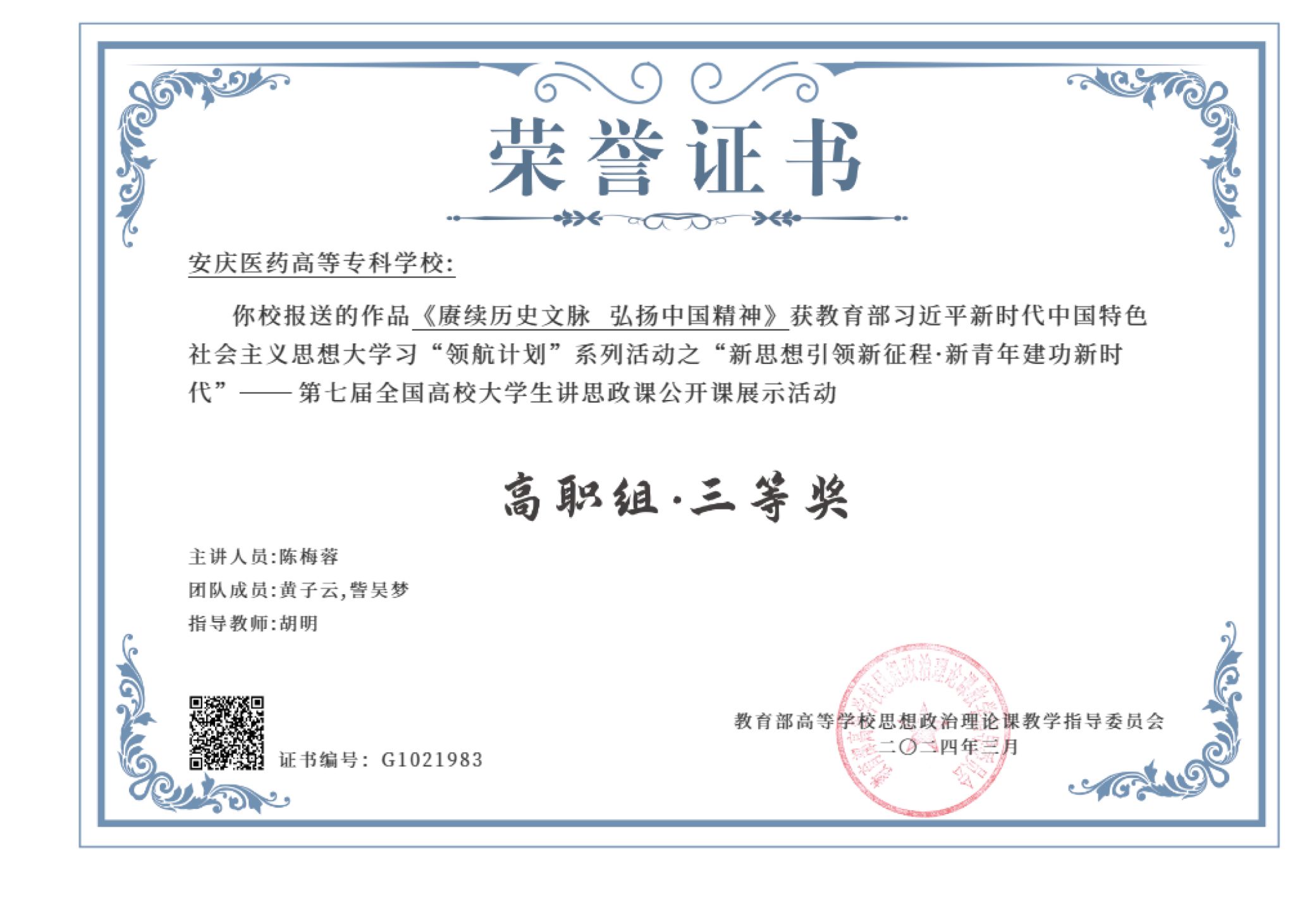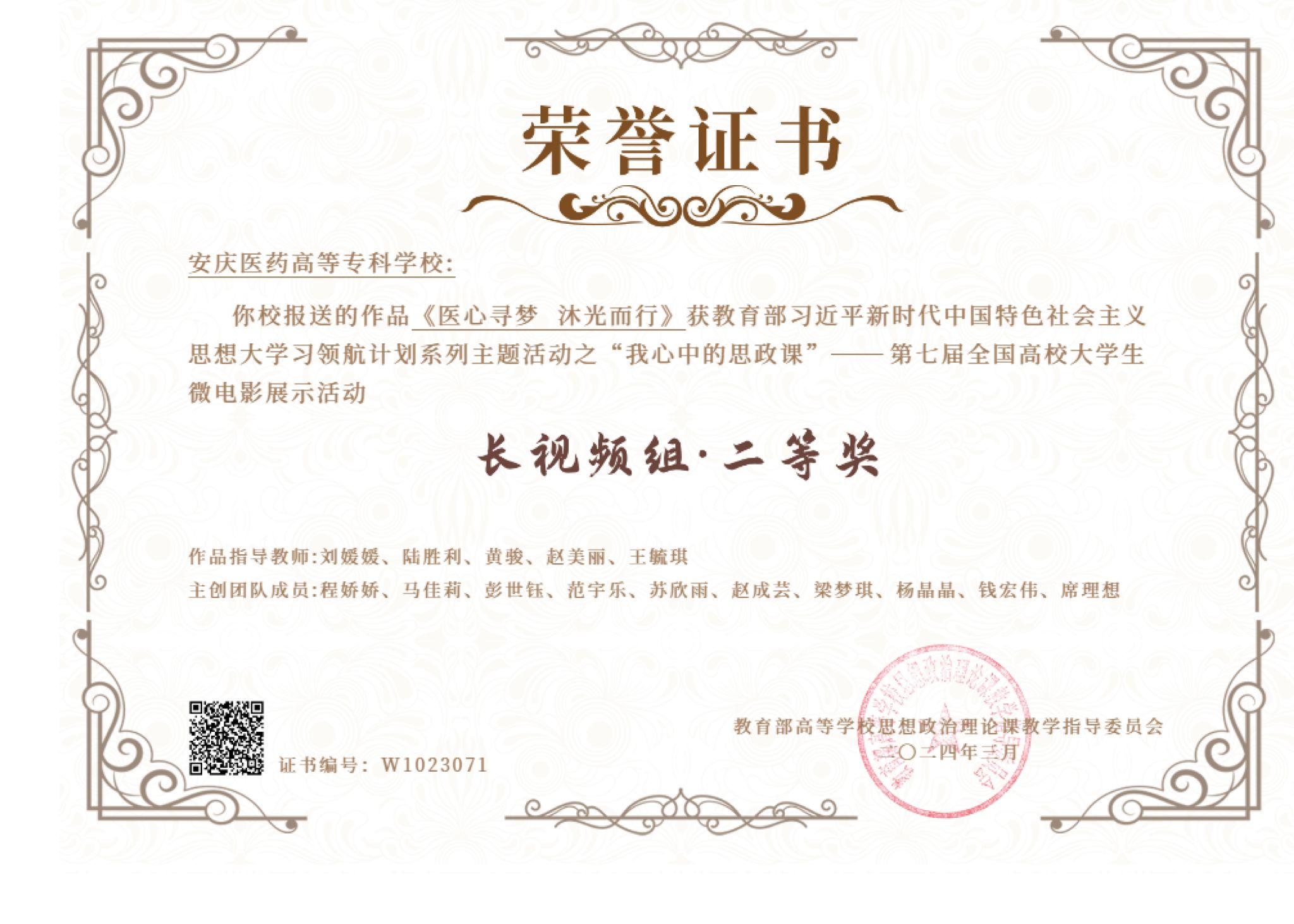 3月18日,由教育部高校思政课教学指导委员会主办的“我心中的思政课”第七届全国高校大学生微电影展示活动、“新思想引领新征程·新青年建功新时代”第七届全国高校大学生讲思政课公开课展示活动获奖名单正式公布。今年会报送的作品《医心寻梦 沐光而行》获大学生微电影长视频组全国二等奖;作品《赓续历史文脉 弘扬中国精神》获大学生讲思政课高职组三等奖。这是今年会思政课教师指导学生在教育部组织的全国大赛中取得的新突破,充分展现了今年会师生扎实的马克思主义理论素养、昂扬奋进的精神风貌和思想政治理论课守正创新的鲜明特点。