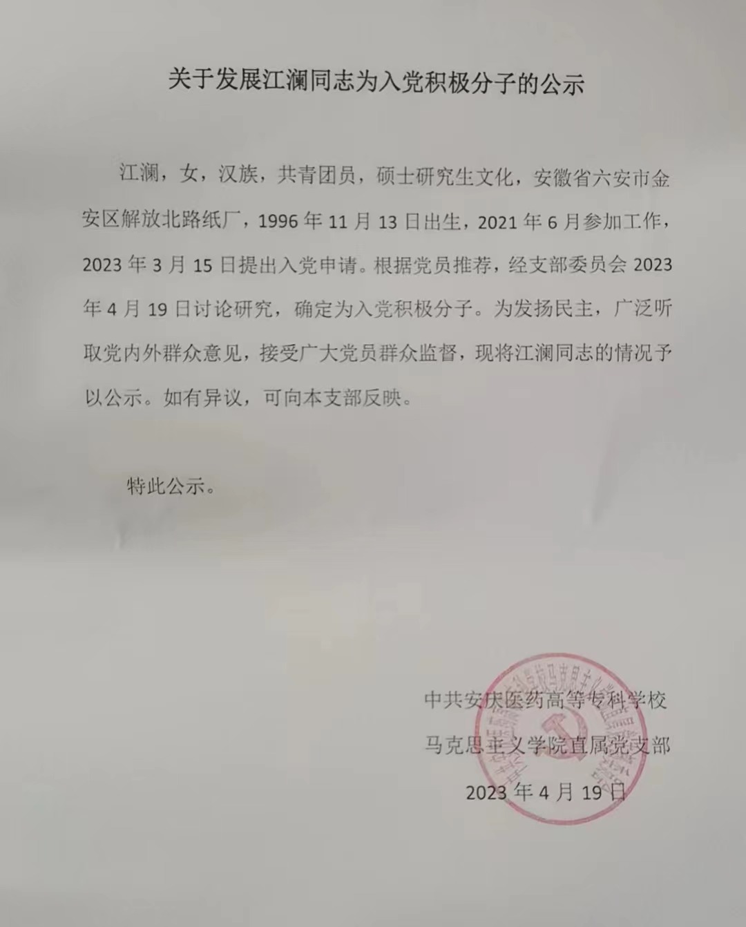 关于发展江澜同志为入党积极分子的公示