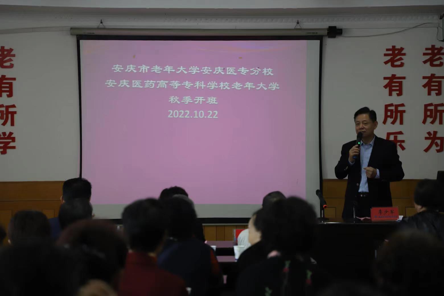 10月22日上午,安庆市老年大学安庆医专分校、校老年大学在海军安庆医院开班。开班式由校老年大学常务副校长李少军主持。