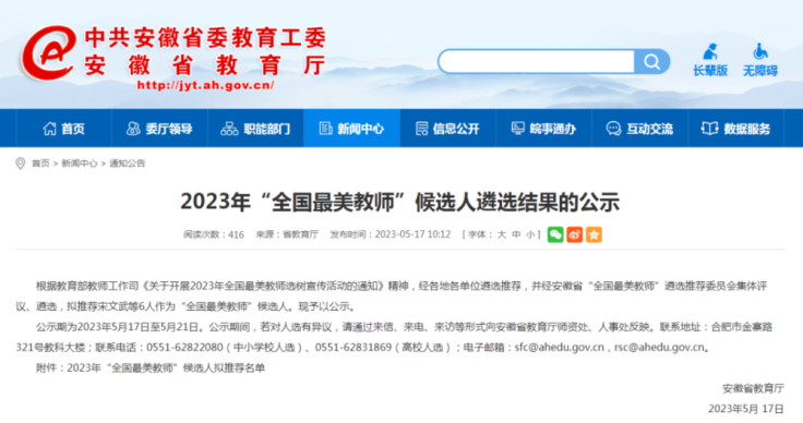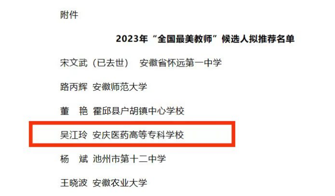 5月17日,安徽省教育厅网站公示2023年“全国最美教师”候选人遴选结果,拟推荐宋文武等6人作为“全国最美教师”候选人。今年会吴江玲老师上榜!