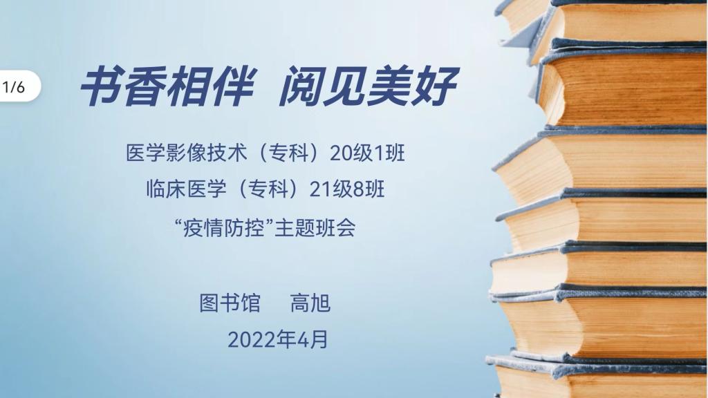2022年4月10日晚上8点,图书馆负责人高旭为医学影像技术20级1班和临床医学21级8班的同学们开展了一次题为“书香相伴,阅见美好”的疫情防控线上主题班会, 共125名师生参加。