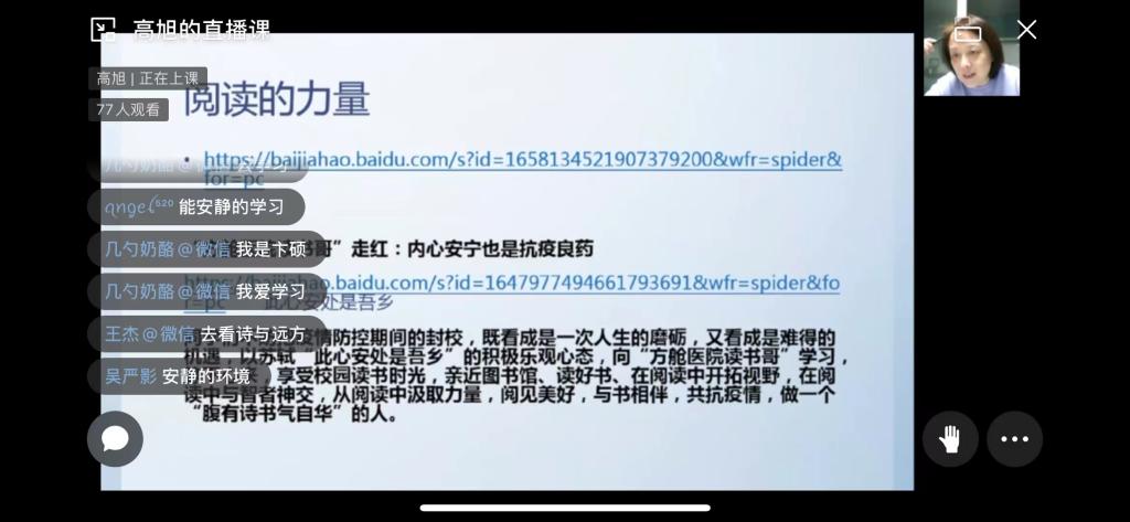 高旭首先强调了在当前国内疫情呈多点散发与局部爆发态势下,为确保校园平安稳定,加强疫情防控措施实行校园封闭管理的必要性和重要性,回顾了三月初以来学校的疫情防控工作,并列举了若干在疫情防控情况下困扰学生的问题。接着她建议同学们从阅读中汲取力量进行有效的心理调适。她为学生介绍了2020年武汉封城期间“方舱医院读书哥”的事例以及宋代词人苏轼的名句“此心安处是吾乡”中所蕴含的人生哲理,勉励同学们以“此心安处是吾乡”的积极乐观心态,向“方舱医院读书哥”学习,静下心来,享受阅读,在阅读中开拓视野,丰富心灵,与书相伴,阅见美好,共抗疫情,做“腹有诗书气自华”的人。最后,高旭向同学们详细介绍了图书馆的图书资源及访问方式,并推荐了三个正在进行中的第八届校园读书节活动。