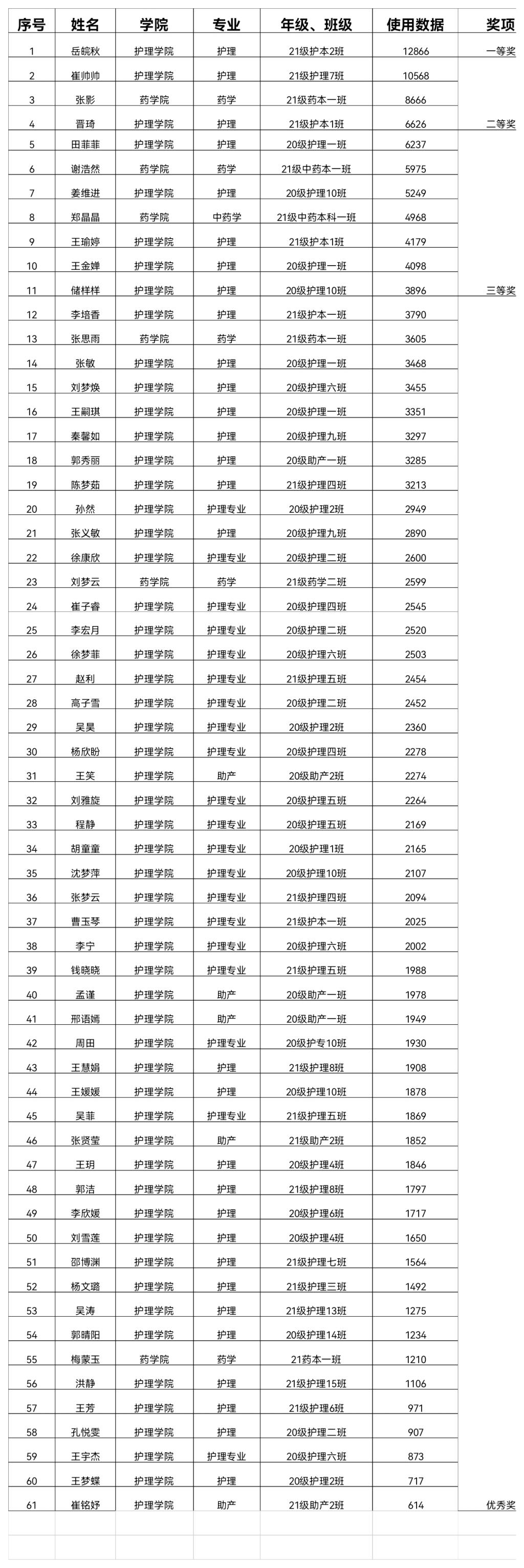 活动期间,协办方通过“学习通”App,每天推出一场由国内领军科研人才、前沿专家担任主讲的优质科普讲座供师生在线学习,讲座内容涵盖大国重器、太空科技、智能农业等前沿科技内容。活动根据师生连续打卡天数及活动期间“学习通”App使用数据量排名,最终21级护本2班岳皖秋同学荣获一等奖,崔帅帅等三名同学荣获二等奖,田菲菲等7名同学荣获三等奖,李培香等50名同学荣获优秀奖。