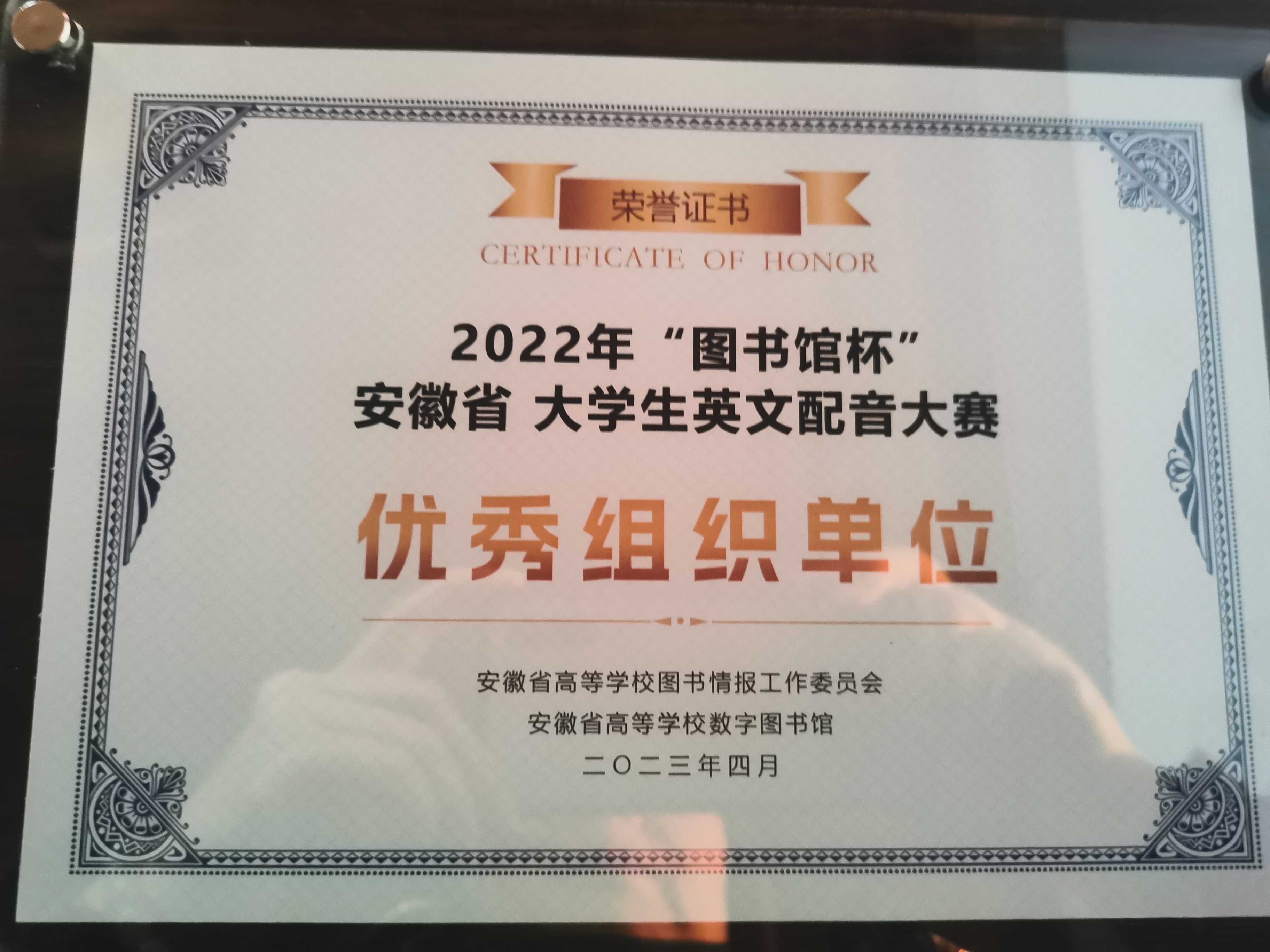 2023年4月8日下午,“声扬家国梦,建功新时代”2022年“图书馆杯”安徽省大学生英文配音大赛总决赛在中国科学技术大学西区图书馆圆满落幕。今年会图书馆获“优秀组织单位”荣誉称号,图书馆负责人高旭受邀到活动现场领奖。