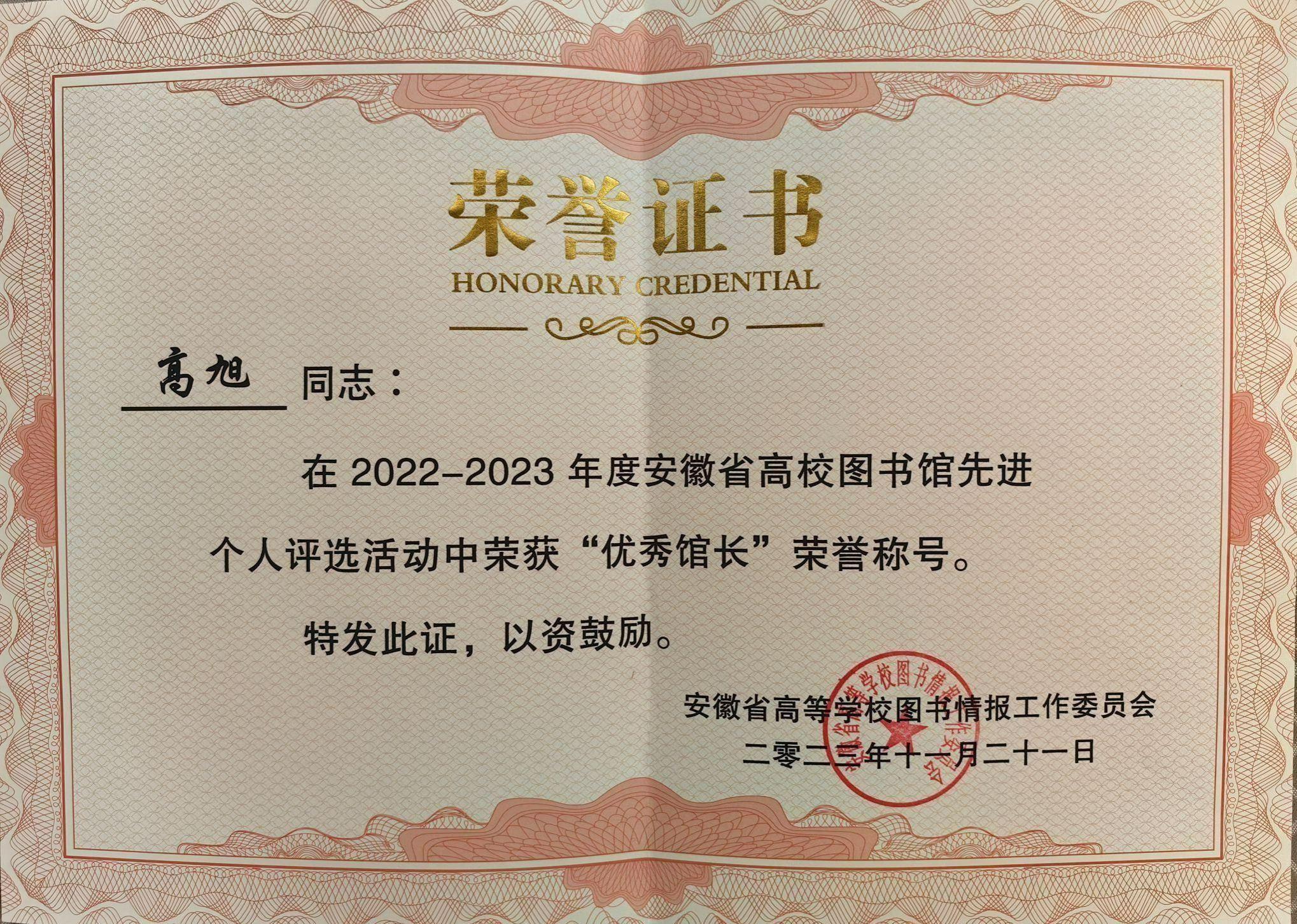 11月30日—12月2日,“安徽省高校图工委成立40周年纪念会暨2023年安徽省高校图书馆馆长年会”在黄山学院召开,全省71所高校参加。今年会图书馆馆长高旭荣获“安徽省高校图书馆2022-2023年度优秀馆长”称号。