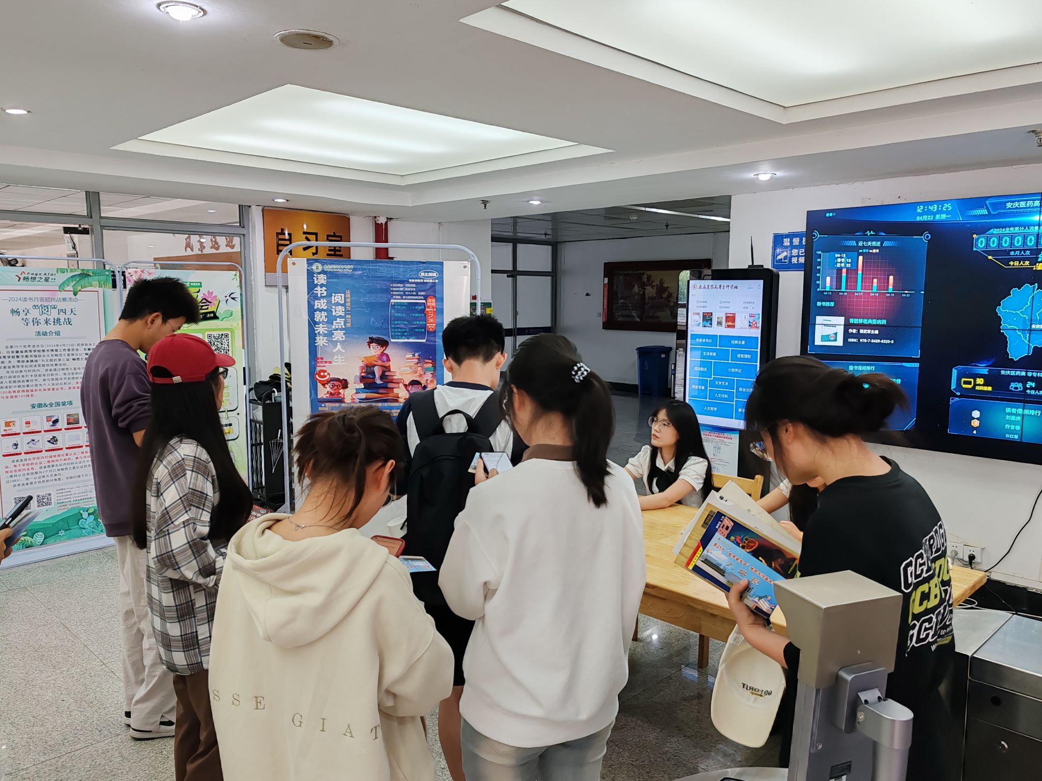 本次活动的主题为“读书成就未来,阅读点亮人生”,共设有“问卷答题”、“图书借阅”、“资源下载”、“关注报名”、“欢乐抽奖”五项内容。活动现场人头攒动,读者纷纷到各打卡区打卡“盖章”:在“问卷答题”区参与问卷调查,通过答题深入了解图书馆布局、设施及第十届校园读书节的系列活动;在“图书借阅”区听馆员详细讲解图书馆自助借还设备及opac查询机的使用方法,并完成借阅4本纸质图书的打卡任务;在“资源下载”区,通过上机操作,沉浸式学习数据库访问、检索和下载文献的方法;在“关注报名”区关注校图书馆新建的微信公众号,并报名参加一项“第十届校园读书节”阅读推广活动;在“欢乐抽奖”区参与抽奖活动。