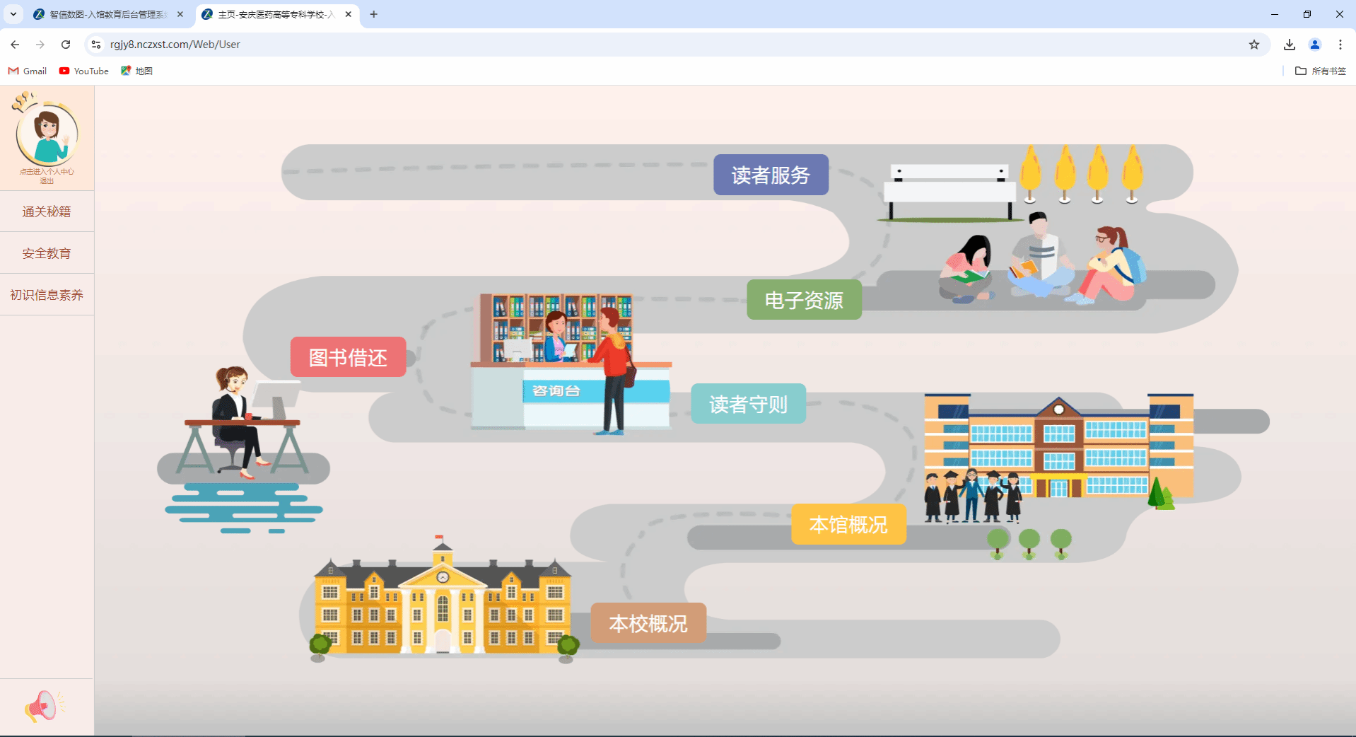 系统采用生动活泼的文字、图像、动画等多媒体,以动漫游戏闯关的形式向同学们直观展示校史教育、图书馆概况、入馆须知、馆藏分布、借阅规则、电子资源、读者服务等内容,使同学们身临其境感受、铭记校史及了解图书馆,并在此学习基础上进入闯关答题环节。