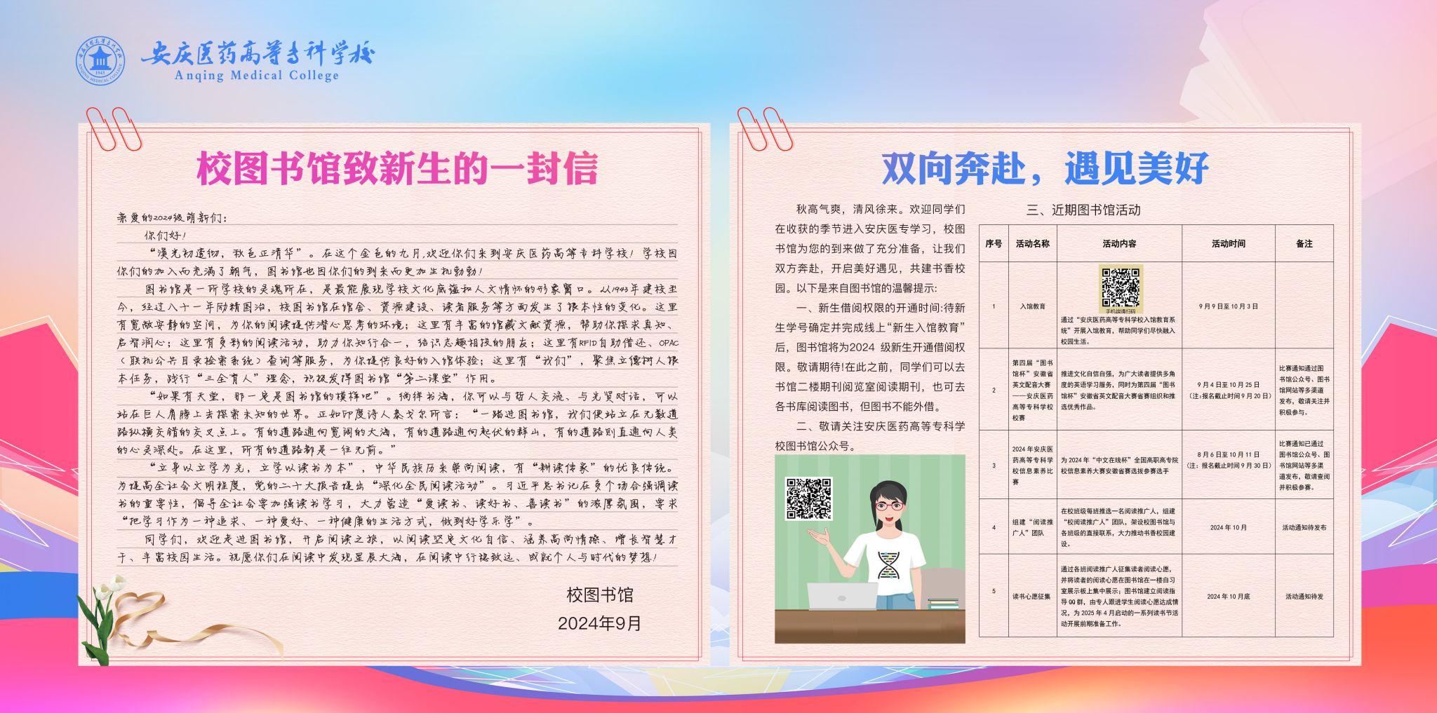 芳华万卷,与你同行。为了迎接新生到来,校图书馆精心筹备了三大篇章,只为点亮萌新们求知路上的第一盏明灯:一是《校图书馆致新生的一封信》——这不仅是一纸书信,更是心灵的桥梁,它承载着图书馆对每一位新成员的深情寄语与殷切期望,引领他们踏入知识的浩瀚星空,开启智慧探索的非凡旅程;二是《双向奔赴,遇见美好——来自校图书馆的温馨提示》——这是一场精心策划的相遇,我们用心铺设每一条路径,助力萌新们在活动中成就自我,让每一次相遇都成为心灵与智慧的双向奔赴,遇见生命中不可多得的美好;三是《2024年度校图书馆活动图片展》——一幅幅生动的画面,定格了过往的辉煌与精彩,它们不仅是图书馆活力的见证,更是未来无限可能的预告。在这里,每一次活动都是一次成长的契机,共同编织属于青春的斑斓记忆。