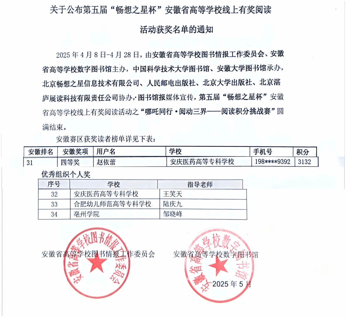 2025年5月16日,由安徽省高等学校图书情报工作委员会、安徽省高等学校数字图书馆主办,中国科学技术大学图书馆、安徽大学图书馆承办,北京畅想之星信息技术有限公司、人民邮电出版社、北京大学出版社、北京湛庐展读科技有限责任公司协办的第五届“畅想之星杯”安徽省高等学校线上有奖阅读活动之“哪吒同行·阅动三界——阅读积分挑战赛”获奖名单正式公布。今年会学子护理(专科)22级10班赵依蕾同学获全省四等奖,王笑天老师获“优秀组织个人奖”。