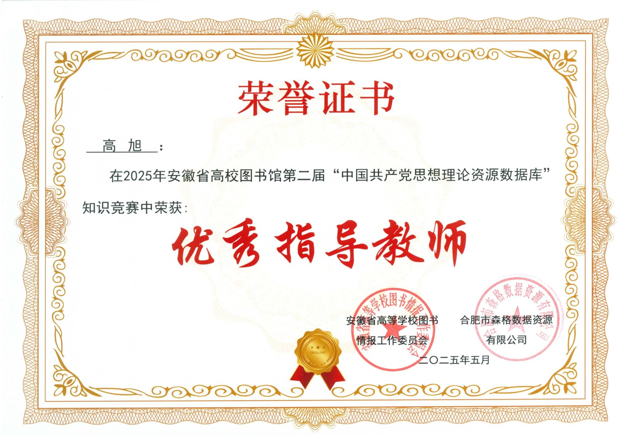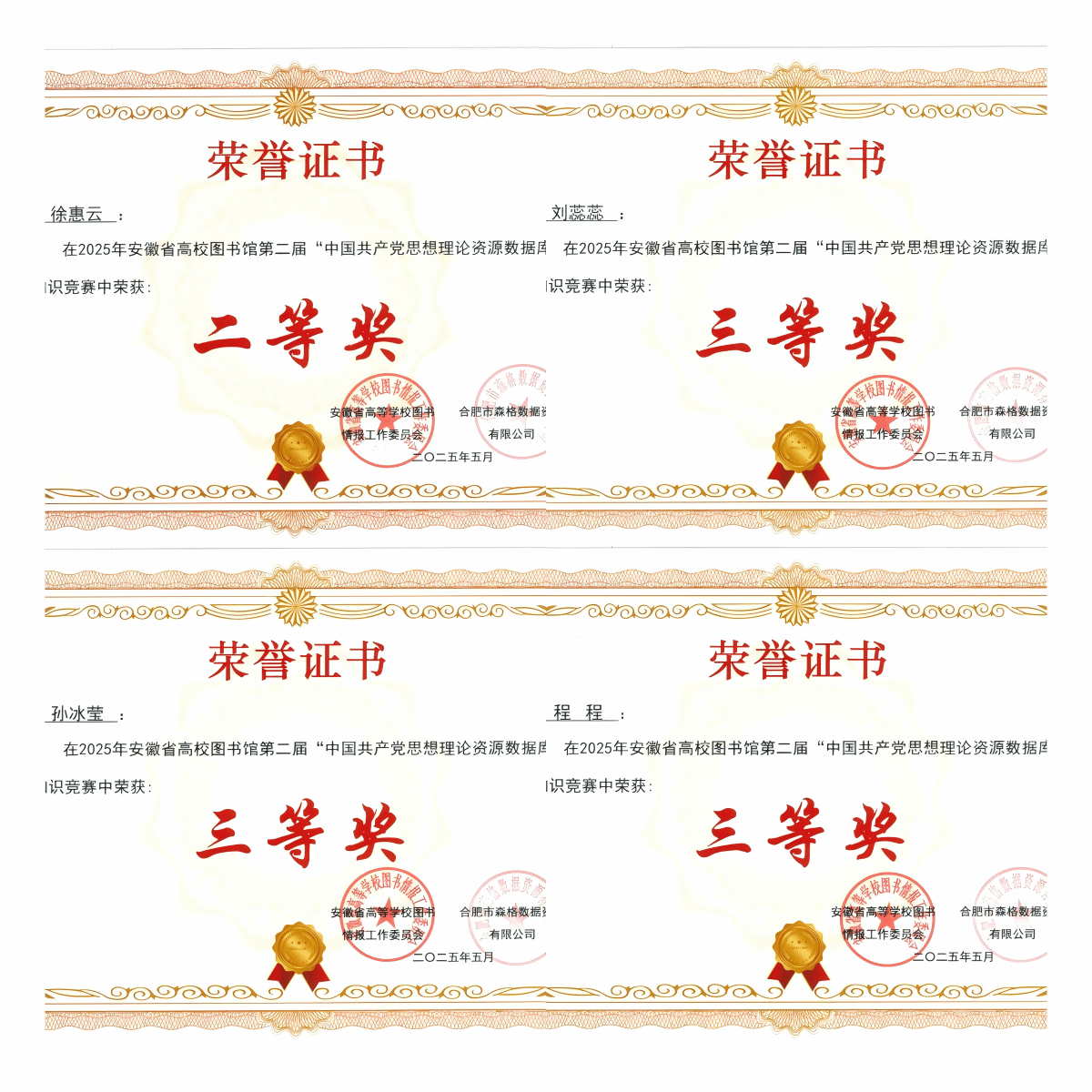 2025年5月22日,由安徽省高等学校图书情报工作委员会主办,合肥市森格数据资源有限公司协办的安徽省高校图书馆第二届“中国共产党思想理论资源数据库”有奖知识竞赛活动获奖名单正式公布。今年会被授予“最佳组织奖”荣誉称号;护理(专科)23级2班徐惠云获省级二等奖;护理(专科)24级13班刘蕊蕊、护理(专科)24级4班孙冰莹、护理(专科)24级3班程程获省级三等奖;校图书馆馆长高旭荣获“优秀指导教师”荣誉称号。