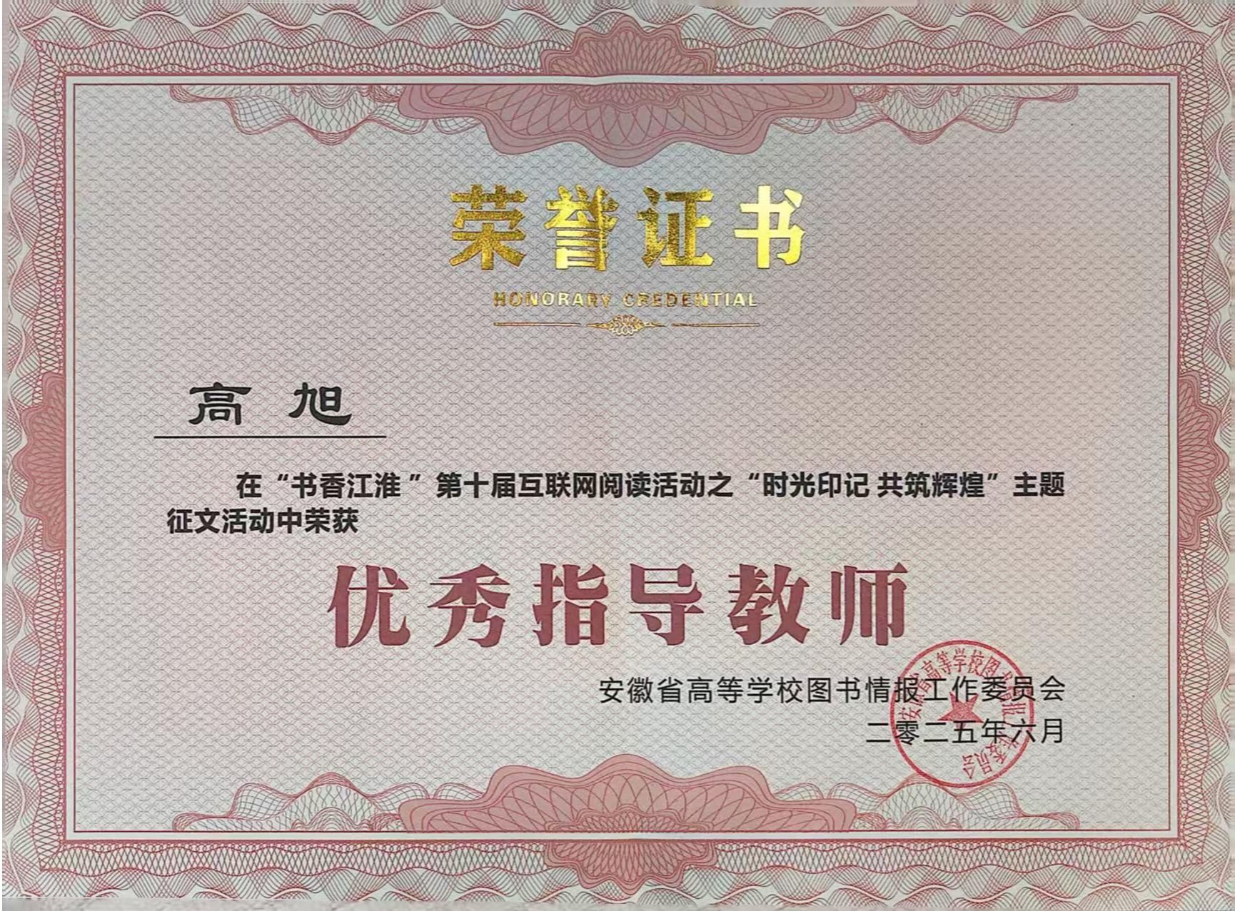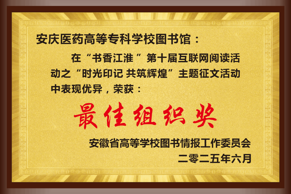 2025年5月26日,由安徽省高等学校图书情报工作委员会主办的第十届书香江淮“时光印记 共筑辉煌”主题征文活动获奖名单正式公布。今年会图书馆被授予“最佳组织奖”荣誉称号;医学院康复治疗技术(专科)24级2班高学晴获高职院校组二等奖(获奖作品:《红色记忆里诞生的梦》);护理学院助产(专科)24级1班岳筱蔓获高职院校组三等奖(获奖作品:《〈红岩〉:信仰之光,照亮征程》);药学院中药学(专科)24级3班王欢欢获高职院校组优秀奖(获奖作品:《脱贫之花葳蕤开,乡兴之略大步走》);校图书馆馆长高旭荣获“优秀指导教师”荣誉称号。