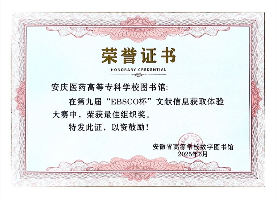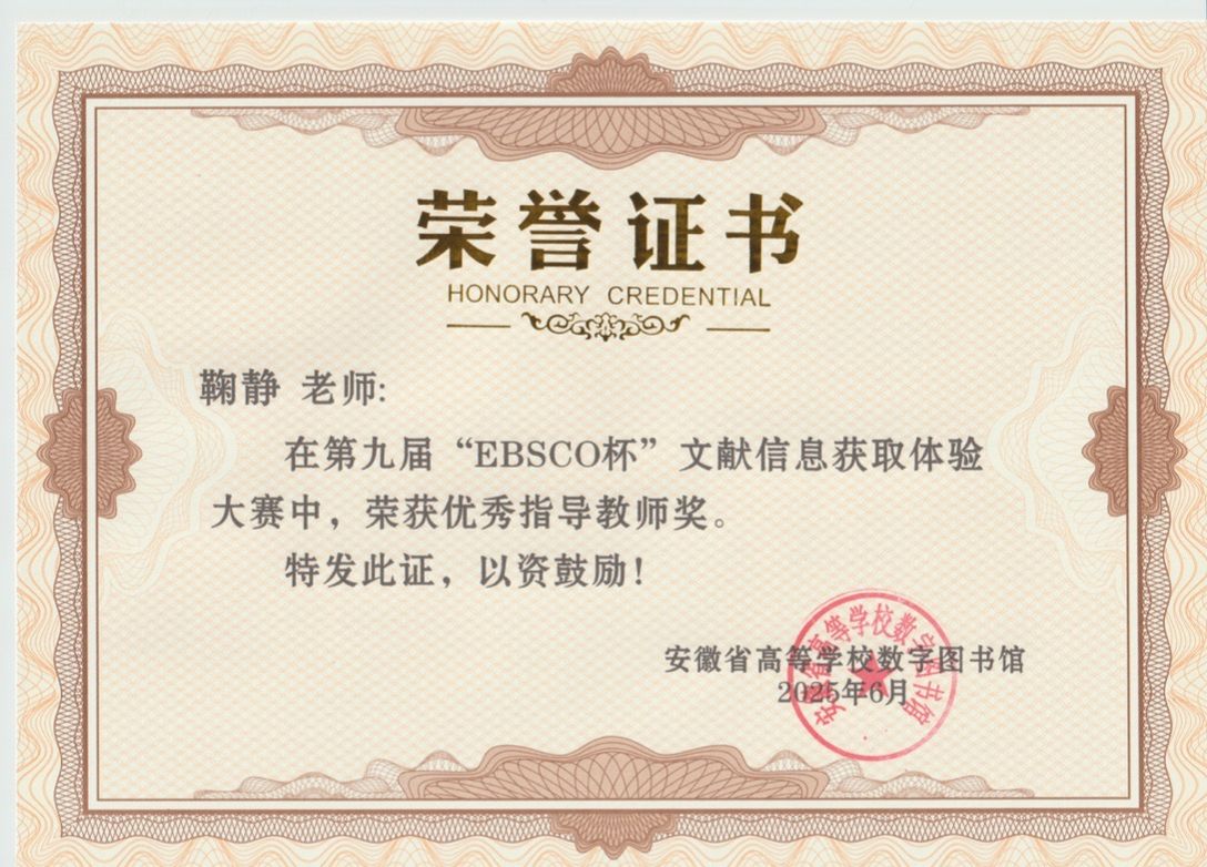 近日,由安徽省高等学校数字图书馆主办的第九届“EBSCO杯”文献信息获取体验大赛落下帷幕,校图书馆组织200余名学生参加本次赛事。在此次比赛中,校图书馆荣获“最佳组织奖”,图书馆鞠静老师荣获“优秀指导教师”奖。(撰稿:鞠静:审核:高旭)