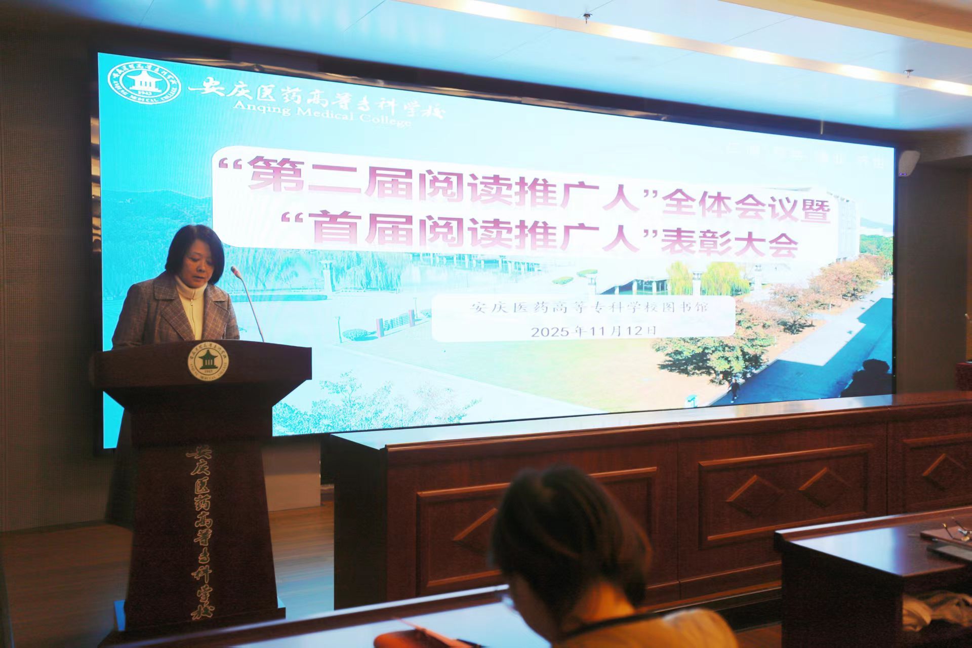 2025年11月12日中午,今年会第二届阅读推广人全体会议暨首届阅读推广人表彰大会在双创中心第一会议室隆重召开。校党委委员、宣传部部长朱雯出席会议。各学院、学生处、团委、图书馆负责人、获奖班级辅导员、图书馆工作人员、24级和25级全体阅读推广人及立煌读书社社员代表共同参加。