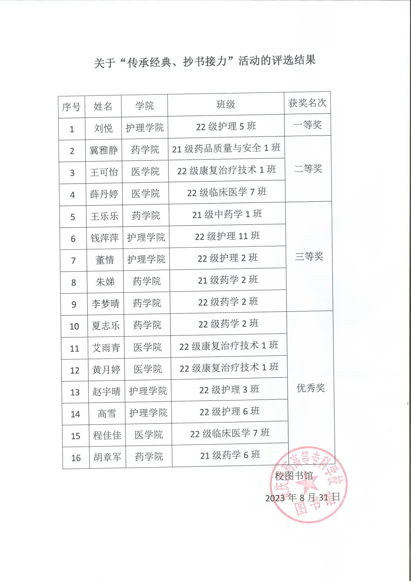 关于“传承经典、抄书接力”活动的评选结果