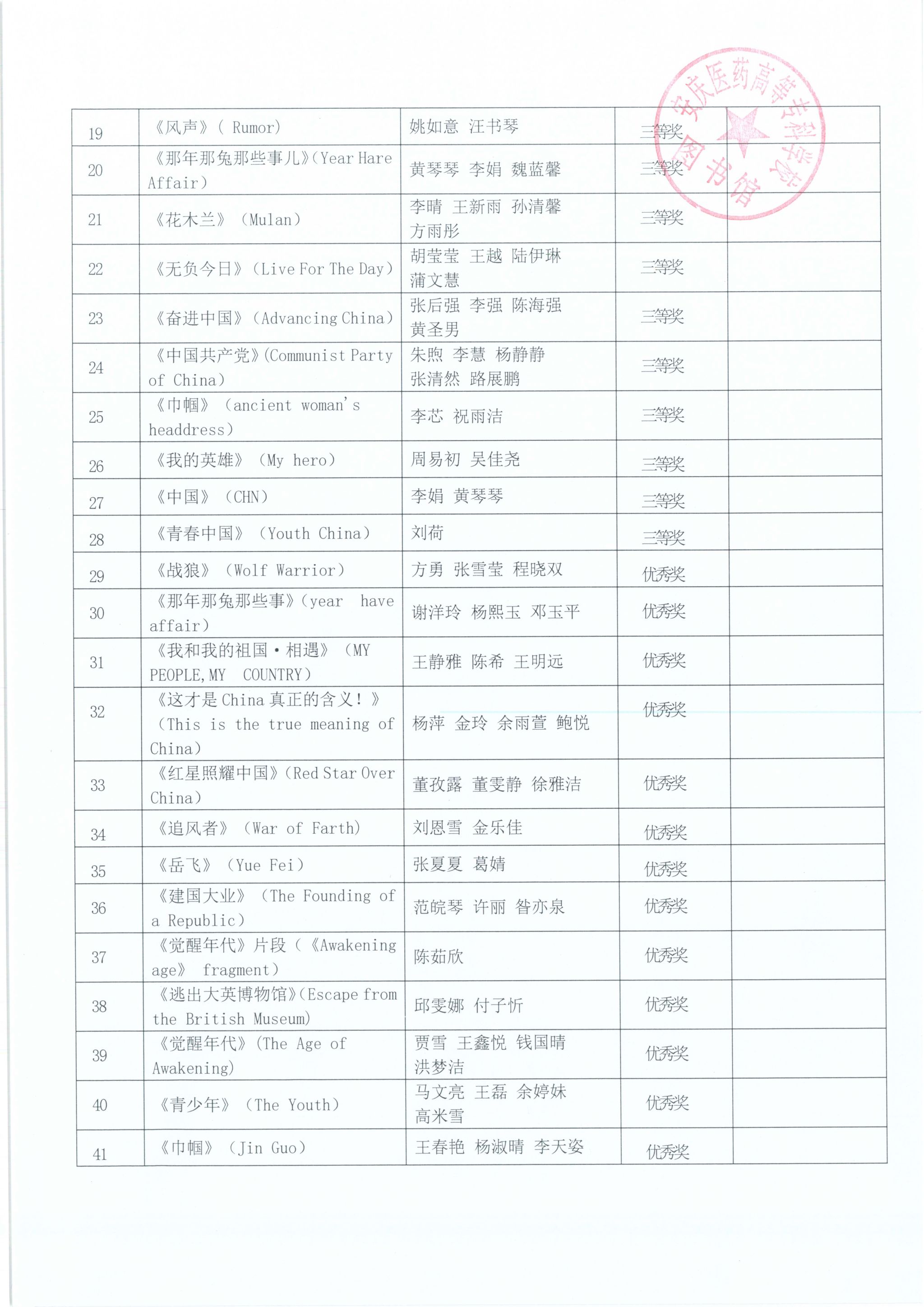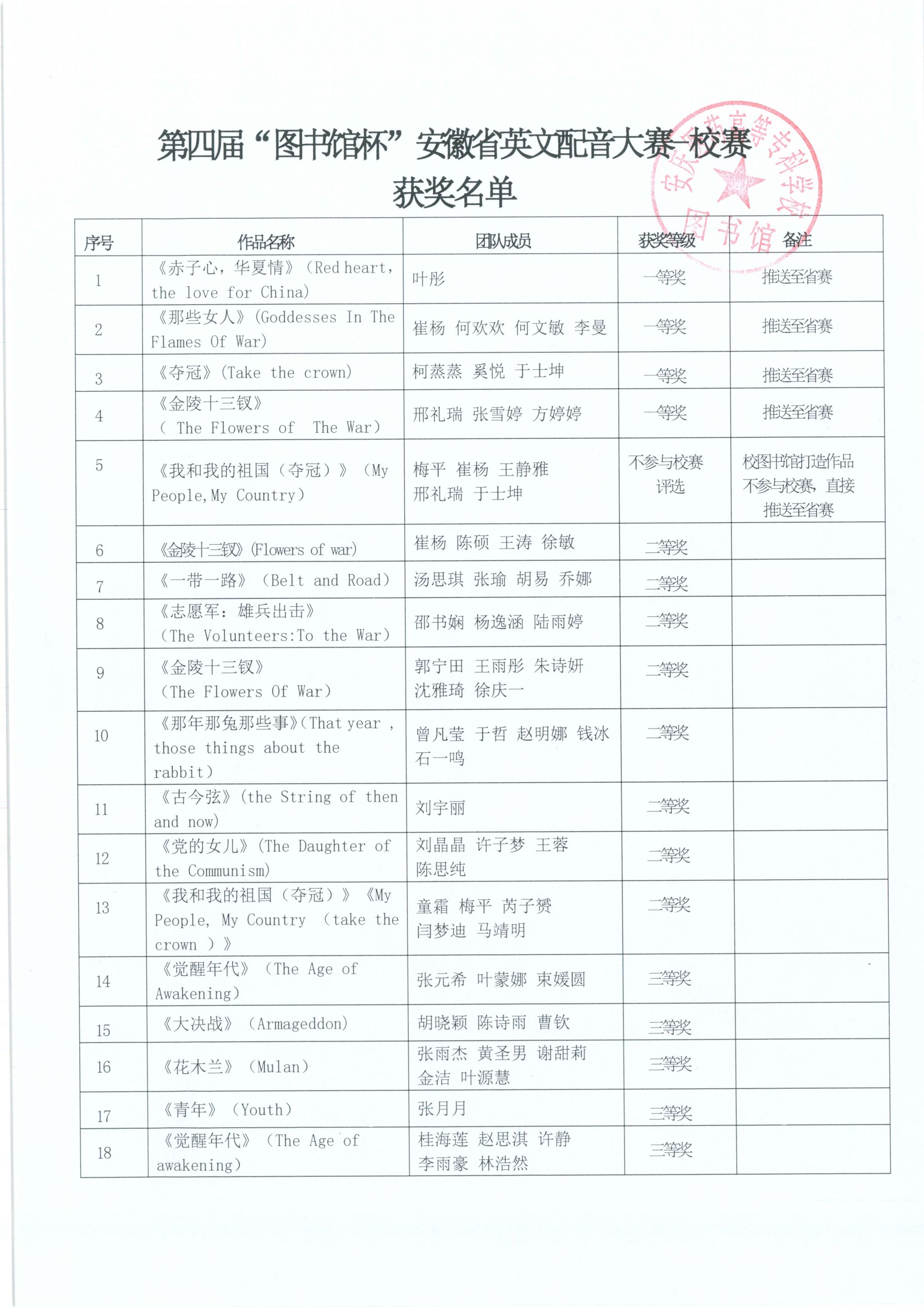 第四届“图书馆杯”安徽省英文配音大赛-校赛获奖名单