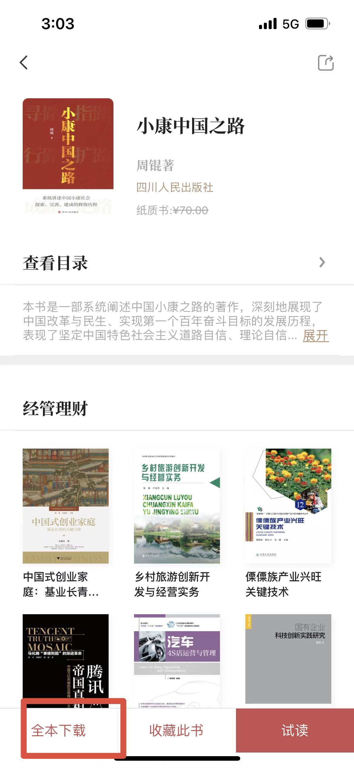第四步:手机端成功进入资源库后,点击“书城”,通过右上方搜索键,即可搜索图书,找到图书后点击左下方“全本下载”,图书进入“我的书架”后,右下方“试读”将显示为“阅读”,此时即可畅读该本图书。