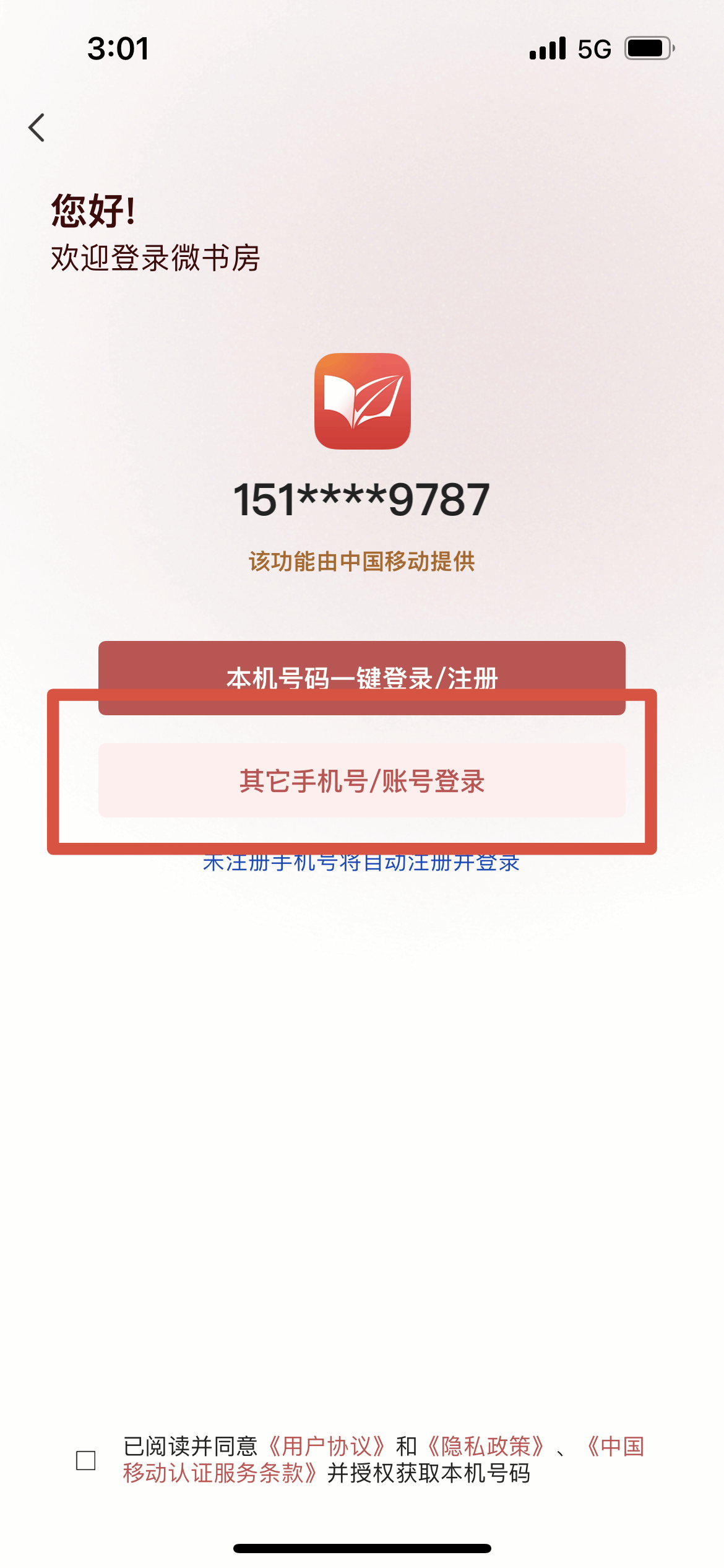 第三步:进入手机“微书房”app,使用“点击登录”,手机界面会显示“本机号码一键登录”和“账号登录”两种方式,首次登录务必使用“账号登录”方式,即使用用户在电脑端注册账号时所使用的“用户名”和密码,完成手机端账号登录;“账号登录”完成后,手机界面会自动弹出“绑定手机”提示,此时输入手机号,即完成手机绑定。(以上程序完成后,第二次使用“微书房”app,既可使用“账号登录”,也可使用“手机登录”两种方式)