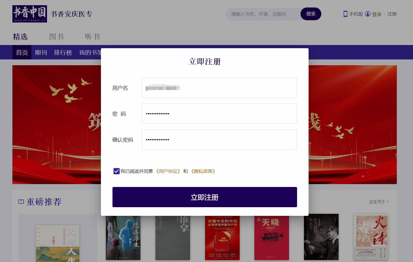 2、点击“立即注册”,完成账号注册(用户名及密码自行设置)。完成账号注册后,即可在电脑端搜索书名,在线阅读。