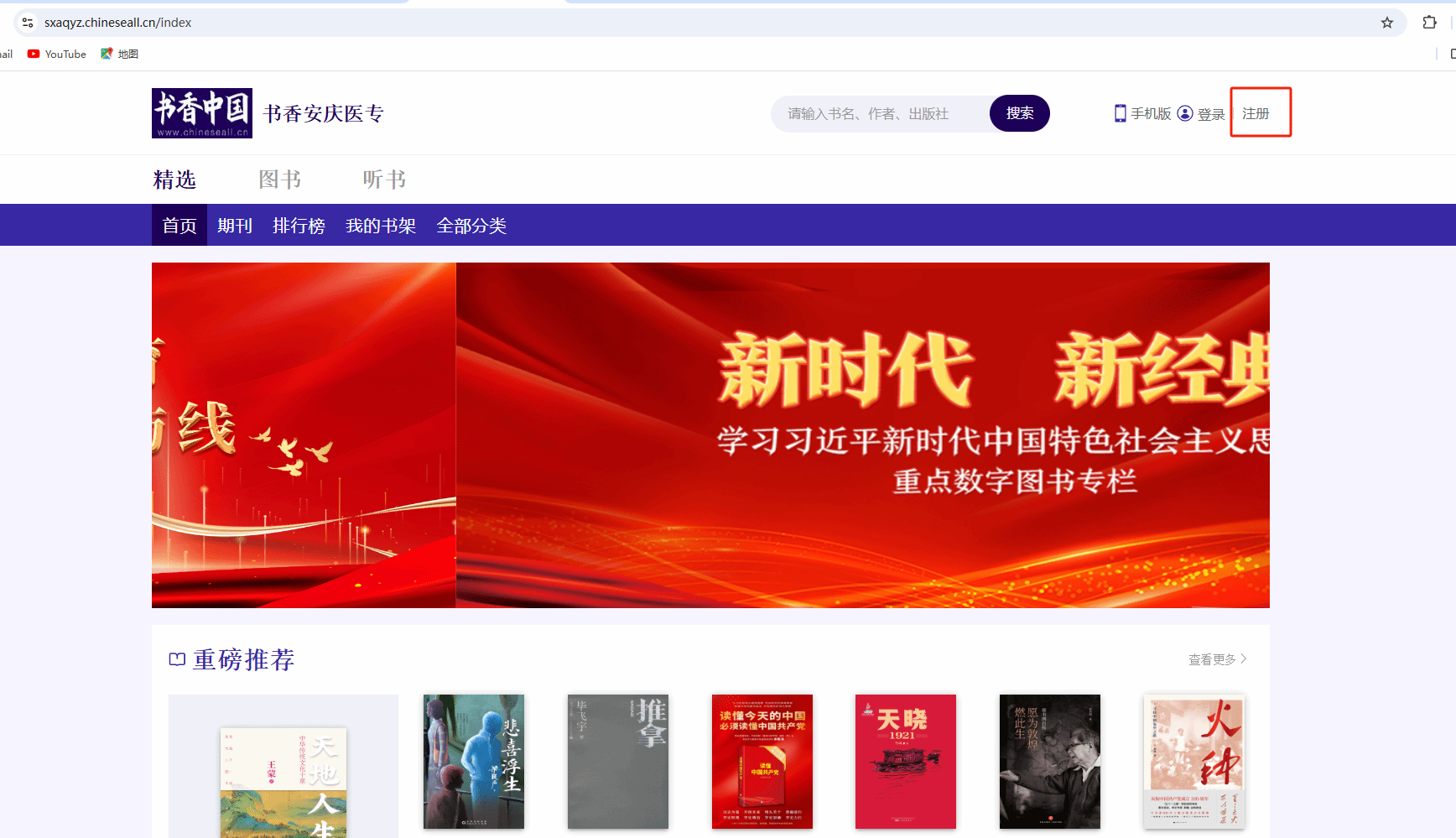 1、在校园网IP范围内(使用AQMC—STU无线网连接网络)登录“书香安庆医专”http://sxaqyz.chineseall.cn,点击右上角“注册”按钮进行账号注册。