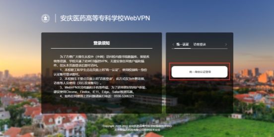 1、校园网外登录(校园网内忽略1、2步骤):浏览器输入网址http://webvpn.aqmc.edu.cn/login,进入首页,点击页面【统一身份认证登录】,输入校园统一身份认证账号账密。