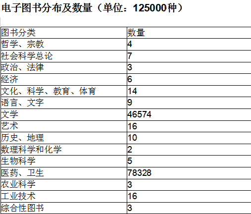 我馆以本地镜像的形式购买了电子图书12.5万册。包含中图法分类的其中15种(详见图表),其中以I 文学类和R 医药、卫生为主。