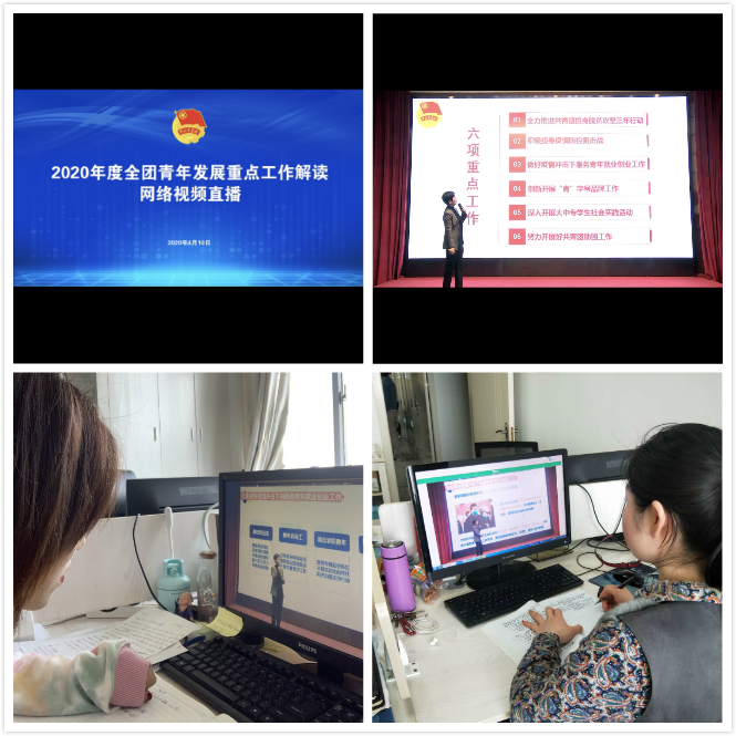 4月10日上午9:30 ,校团委组织全体团总支老师收看了2020年全团青年发展重点工作解读直播。此次网络视频会议首先由团中央青年发展部的负责同志对2020年度共青团发展重点工作做了部署安排并结合共青团投身脱贫攻坚三年行动、打好疫情防控阻击战、疫情冲击下的服务青年就业创业工作、服务青年就业创业工作、“青”字号品牌创建工作、大中专学生社会实践活动六项重点工作进行了解读。随后多省级团委和大学团委的负责同志作了经验交流汇报。